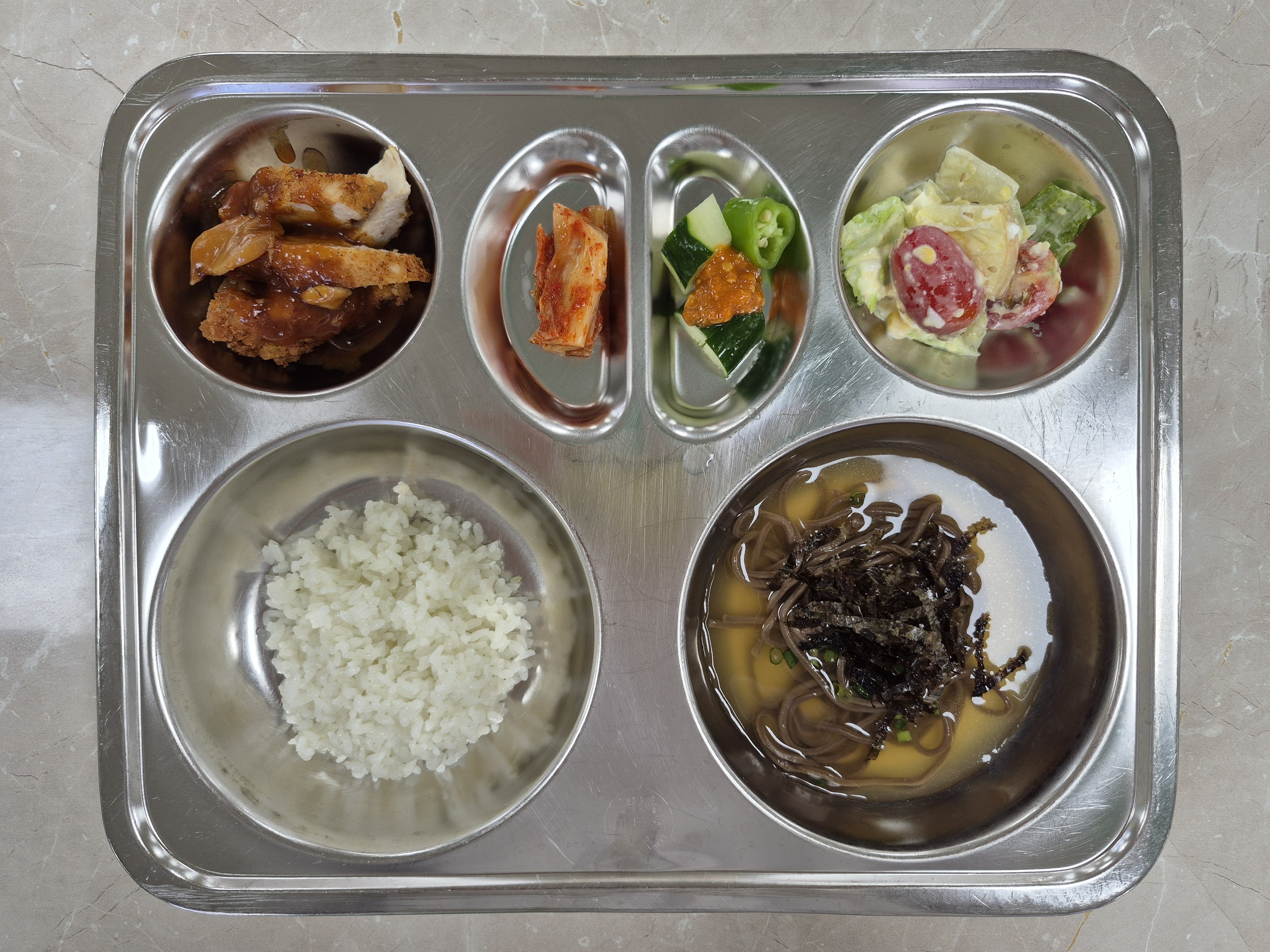 2025년 9월16일 (화) 식단: 클로렐라쌀밥, 미니냉메밀국수, 양상추샐러드, 치킨커틀렛, 배추김치, 오이고추쌈(자)
