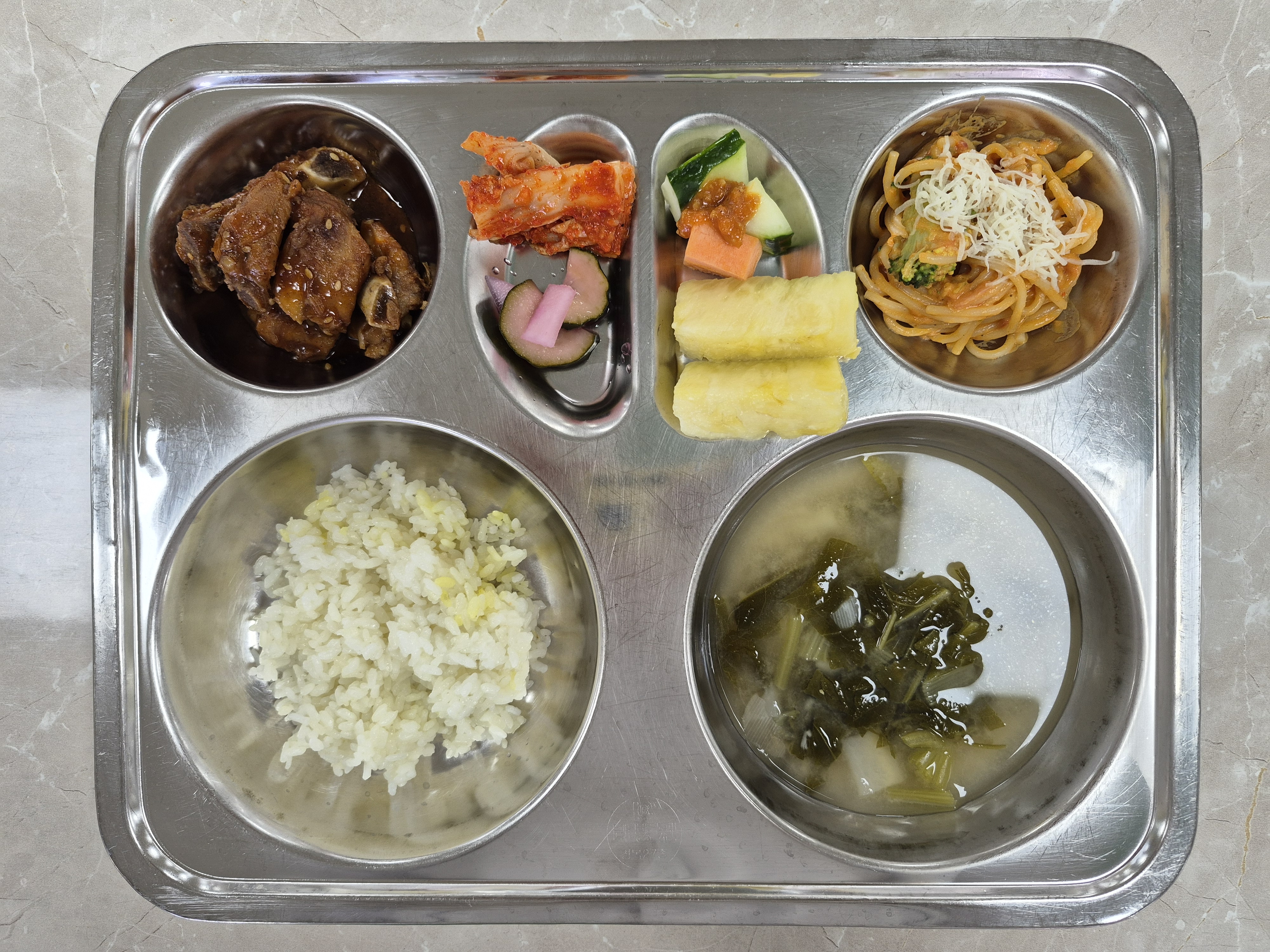 2025년 9월23일 (화) 식단: 강황쌀밥, 아욱국, 수제피클, 로제스파게티, 등갈비바베큐폭립, 배추김치, 파인애플, 오이당근스틱(자)