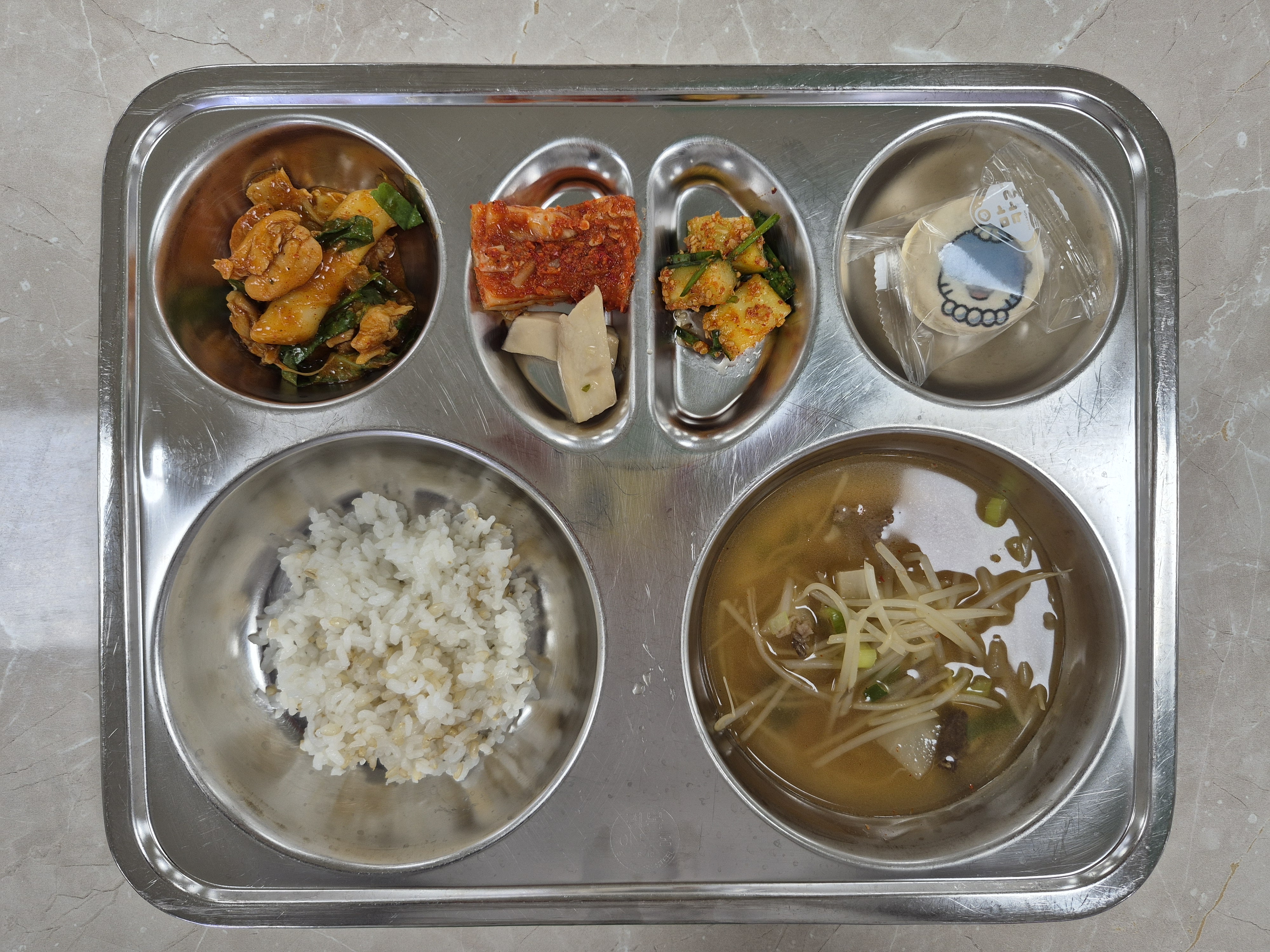 2025년 9월26일(금) 진주하모데이 식단: 발아현미밥, 쇠고기무국, 오이소박이, 뼈없는닭갈비, 배추김치, 진주하모마카롱, 진주새송이버섯볶음(자)