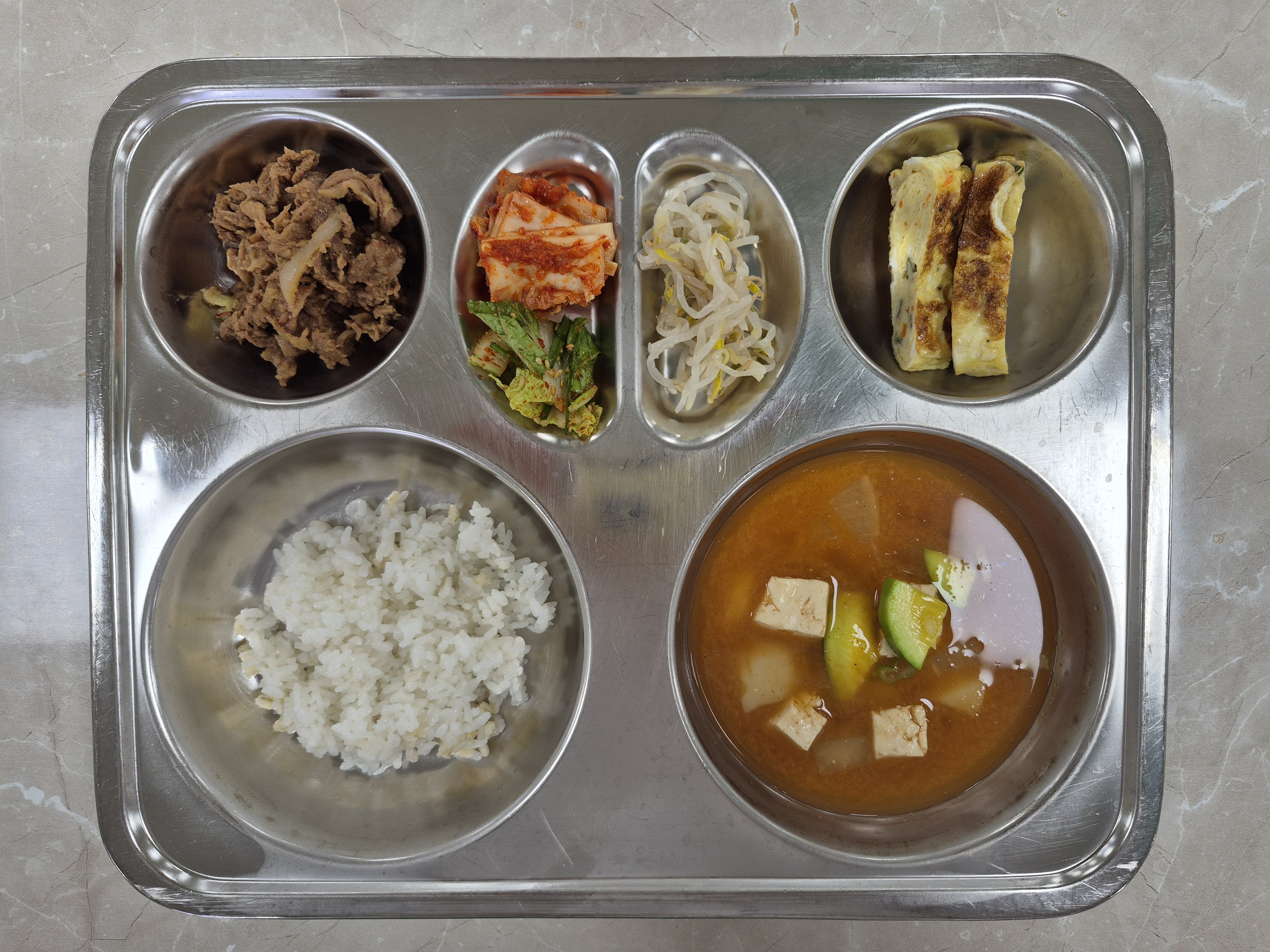 2025년 10월13일 (월) 식단: 찰보리밥, 호박고추장찌개, 얼갈이부추겉절이, 연탄직화간장불고기, 야채달걀말이, 배추김치, 숙주나물무침(자)