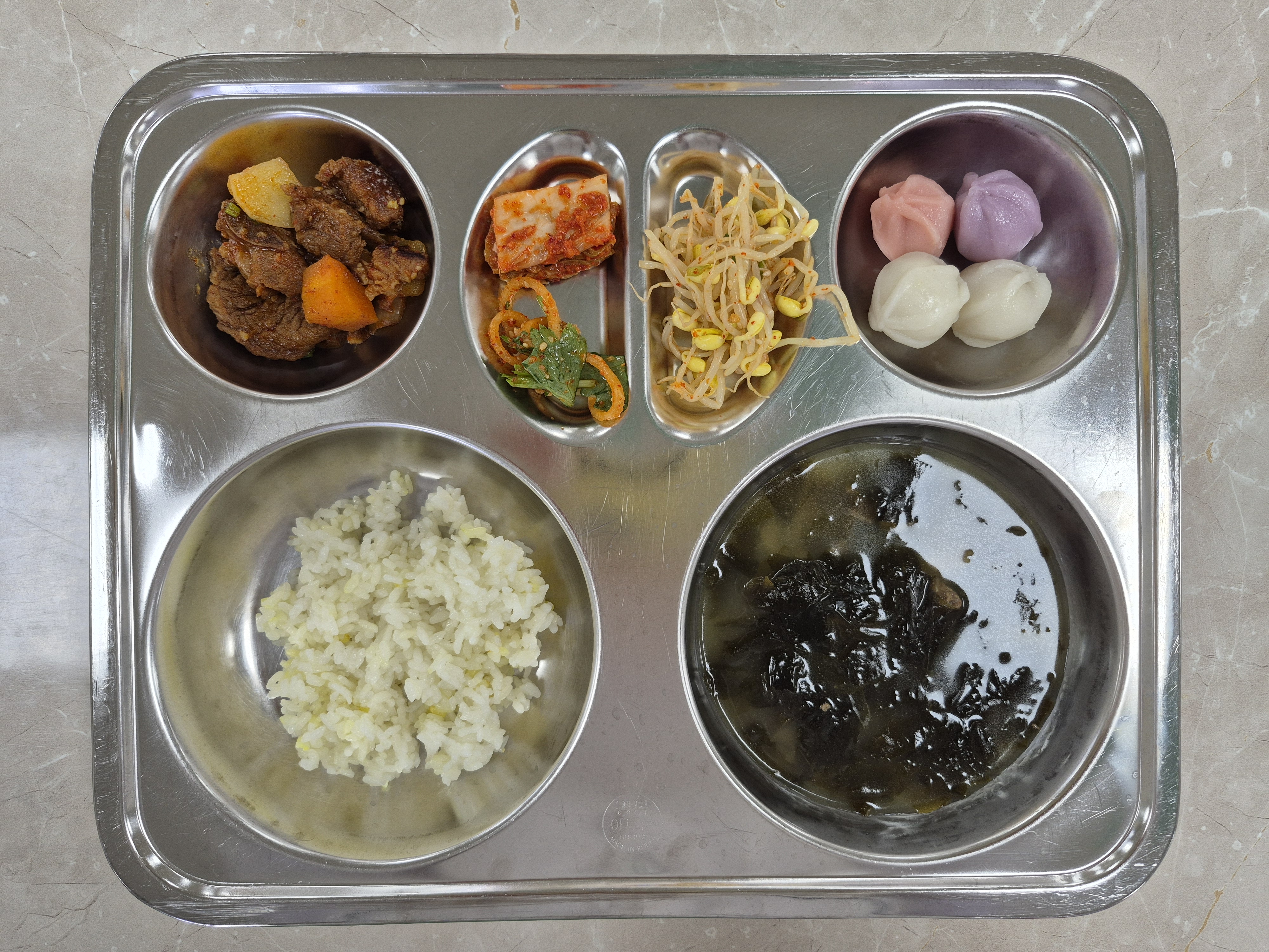 2025년 10월15일 (수) 생일밥상식단: 강황쌀밥, 쇠고기미역국, 동인동찜갈비, 참나물무생채(자), 콩나물무침, 배추김치, 꿀떡