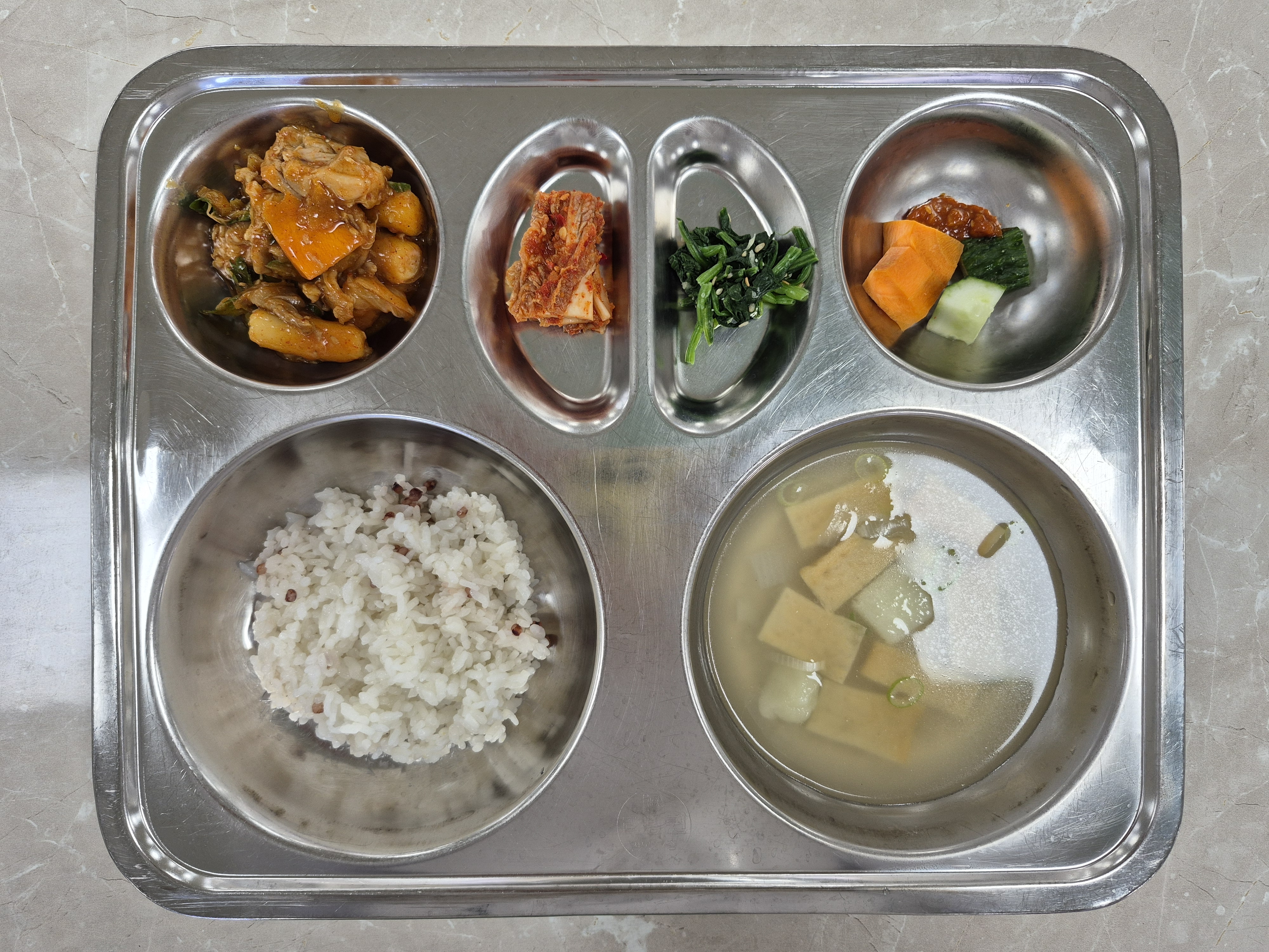 2025년 10월20일 (월) 식단: 차수수밥, 어묵감자애호박국, 시금치나물, 뼈없는닭갈비, 배추김치, 오이당근스틱(자)
