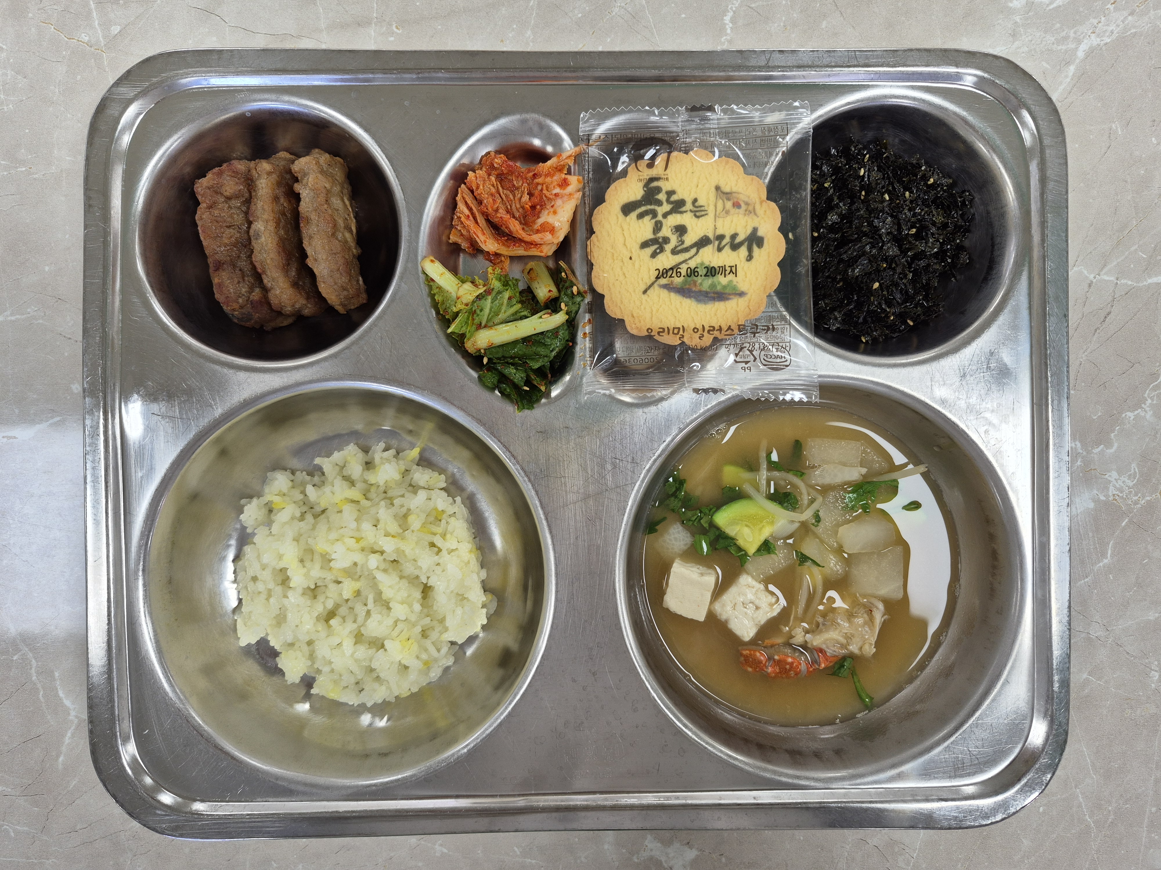 2025년 10월24일 (금) 식단: 강황쌀밥, 꽃게탕, 얼갈이양파겉절이, 복돼지떡갈비, 수제파래김자반, 배추김치, 우리밀독도쿠키