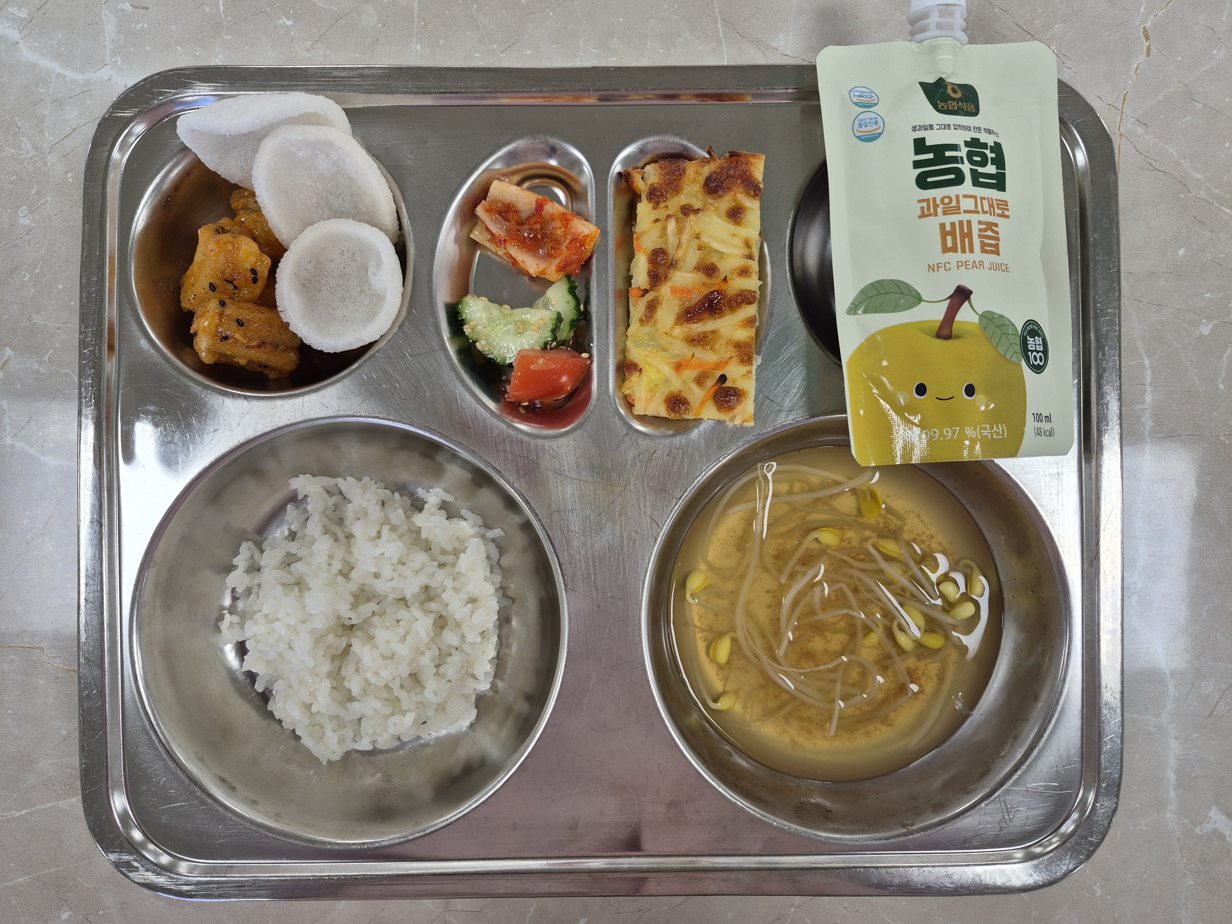 2025년 10월31일 (금) 다체롭데이식단: <백리밥상> 쌀밥, 얼큰콩나물국, 오이토마토무침, 장어강정&새우칩스, 감자채오븐구이, 배추김치, 국산배즙