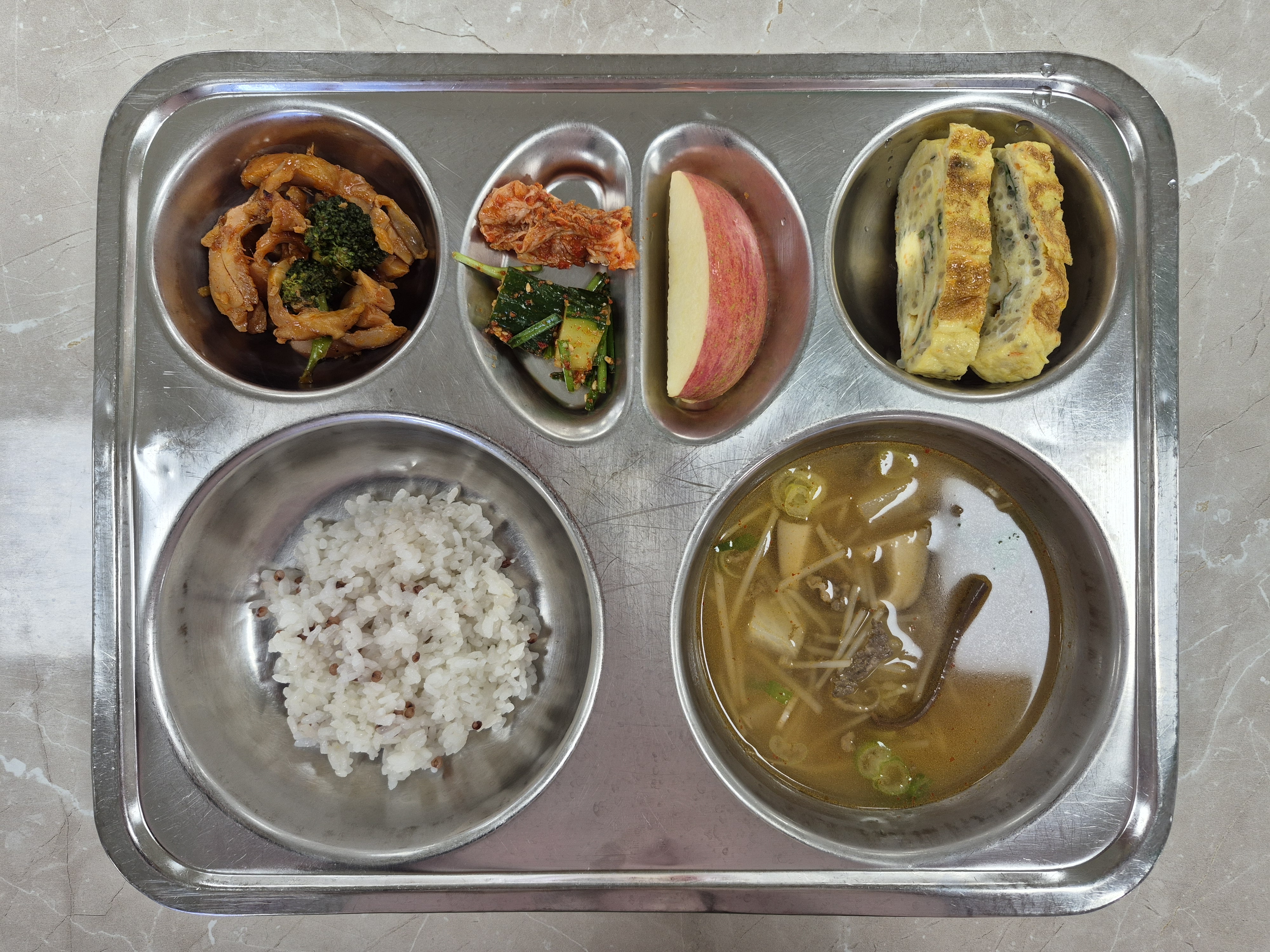 2025년 11월3일 (월) 식단: 차수수밥, 쇠고기무국, 오이소박이, 훈제닭고기채소볶음, 당면달걀말이, 배추김치, 사과