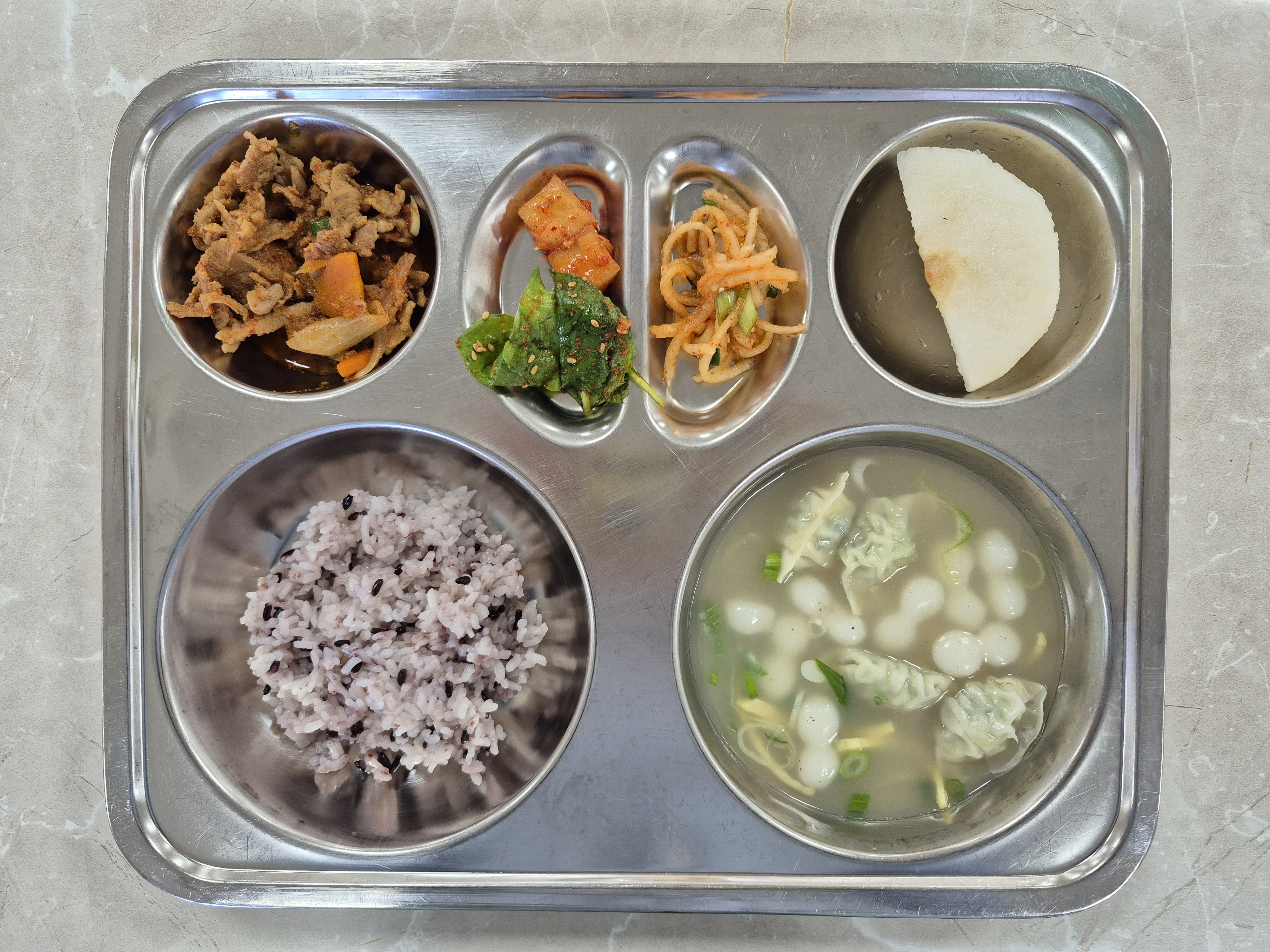 2025년 11월10일 (월) 식단: 발아흑미밥, 조랭이떡만두국, 잔파무생채, 돈육고추장불고기, 깍두기, 배, 겨울초겉절이(자)