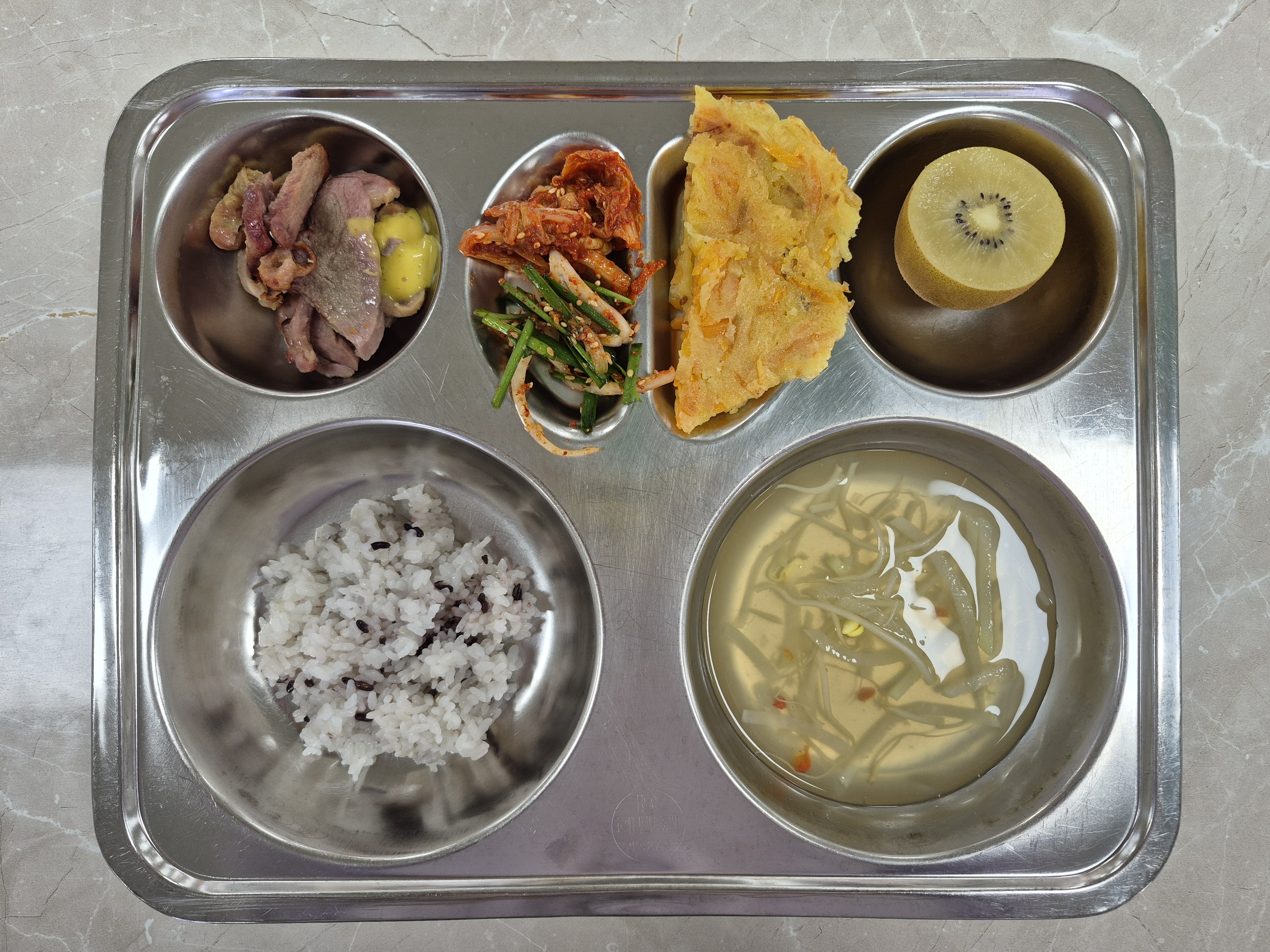 2025년 11월18일 (화) 식단: 발아흑미밥, 콩나물무채국, 부추양파생채, 오리훈제/소스, 늙은호박전, 배추김치, 골드키위