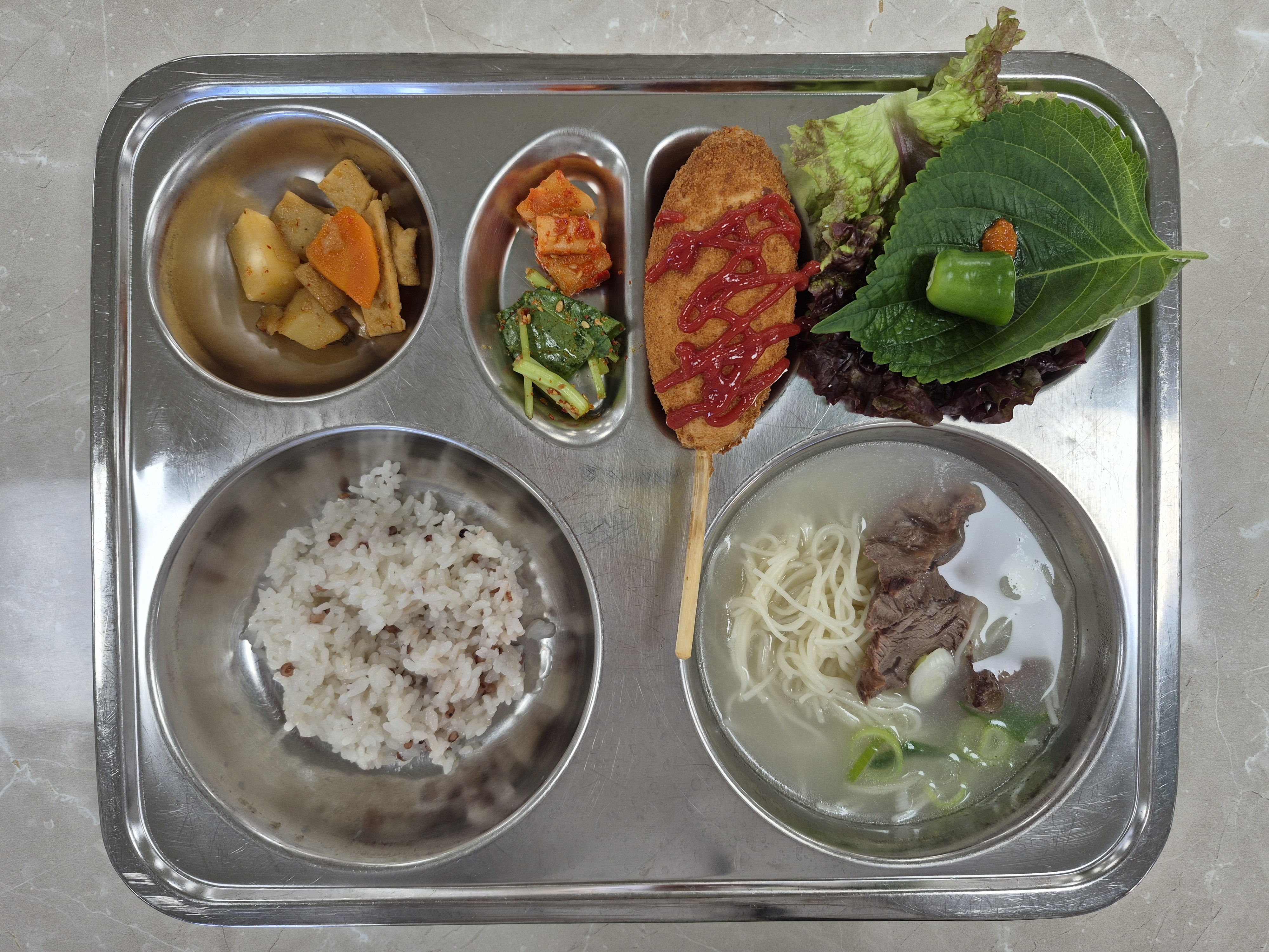 2025년 11월21일 (금) 식단: 차수수밥, 곰탕/소면, 어묵감자조림, 겨울초겉절이, 깍두기, 탱긋핫도그, 상추깻잎쌈(자)