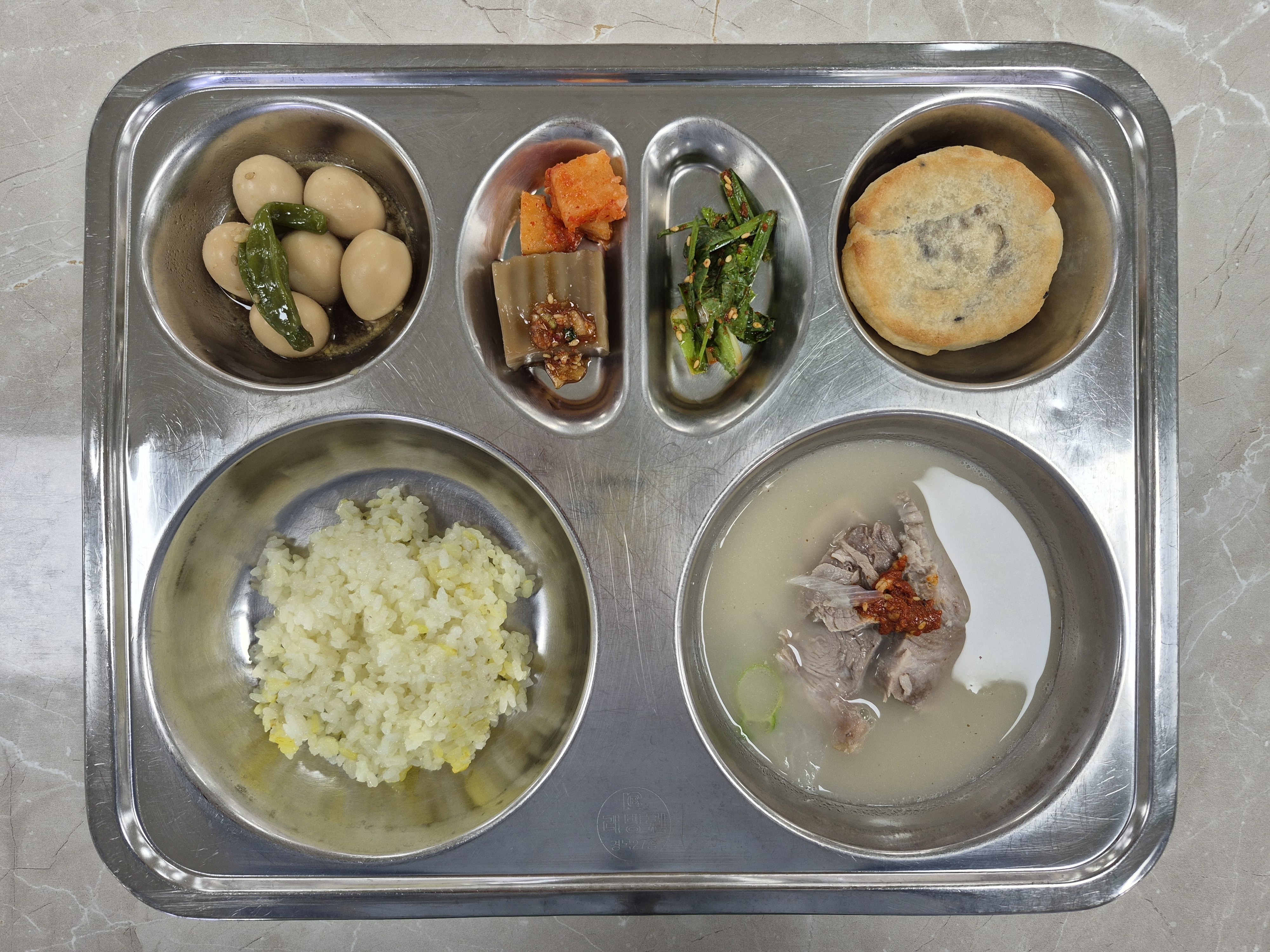 2025년 11월27일 (목) 식단: 강황쌀밥, 돼지따로국밥, 메추리알장조림, 얼갈이부추겉절이, 깍두기, 우리쌀전통씨앗호떡, 도토리묵/양념장(자)