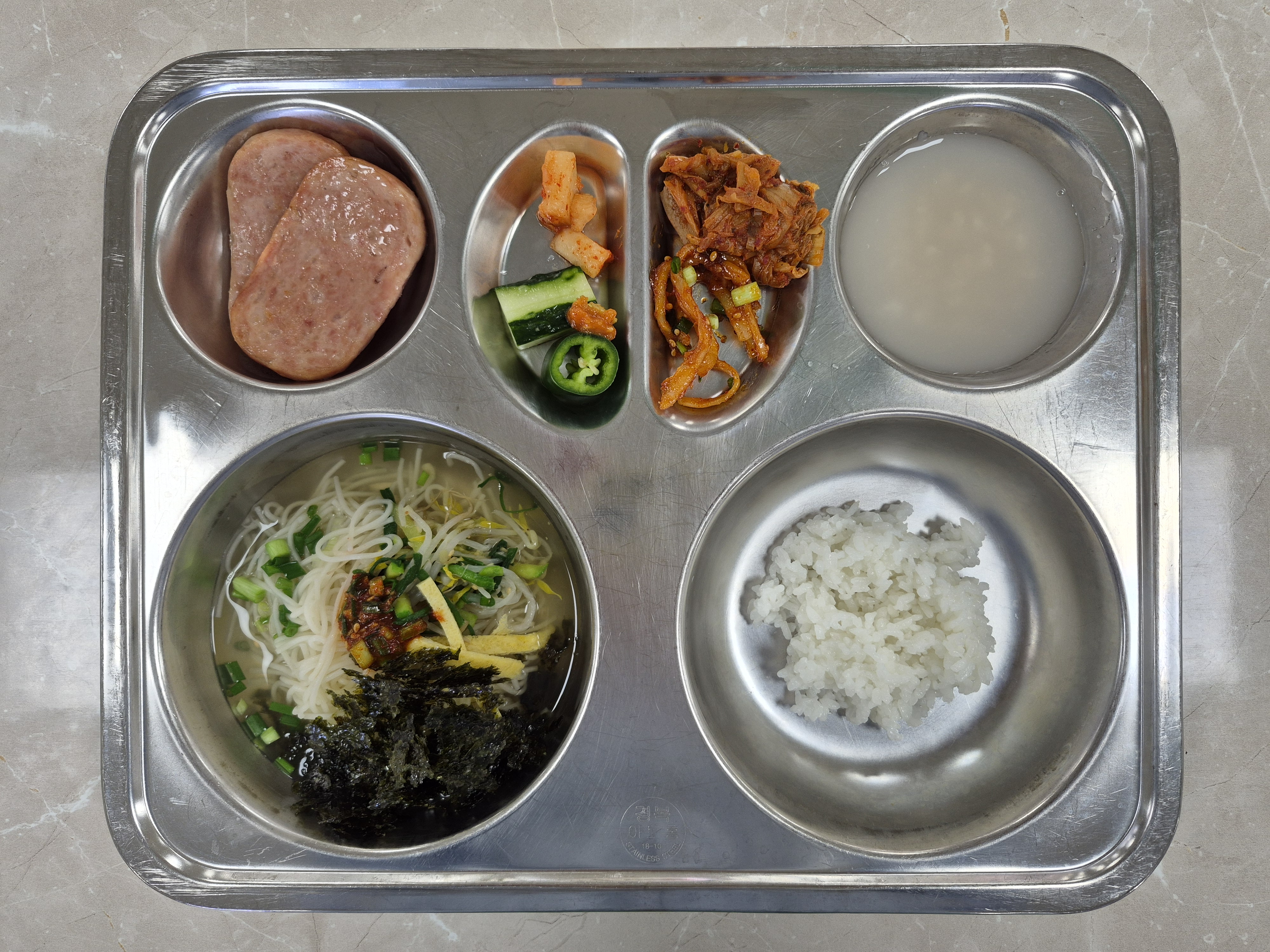 2025년 12월4일 (목) 식단: 쌀밥(자), 누룽지탕(자), 잔치국수, 진미채무침, 김치볶음, 햄구이, 깍두기, 오이고추쌈(자)