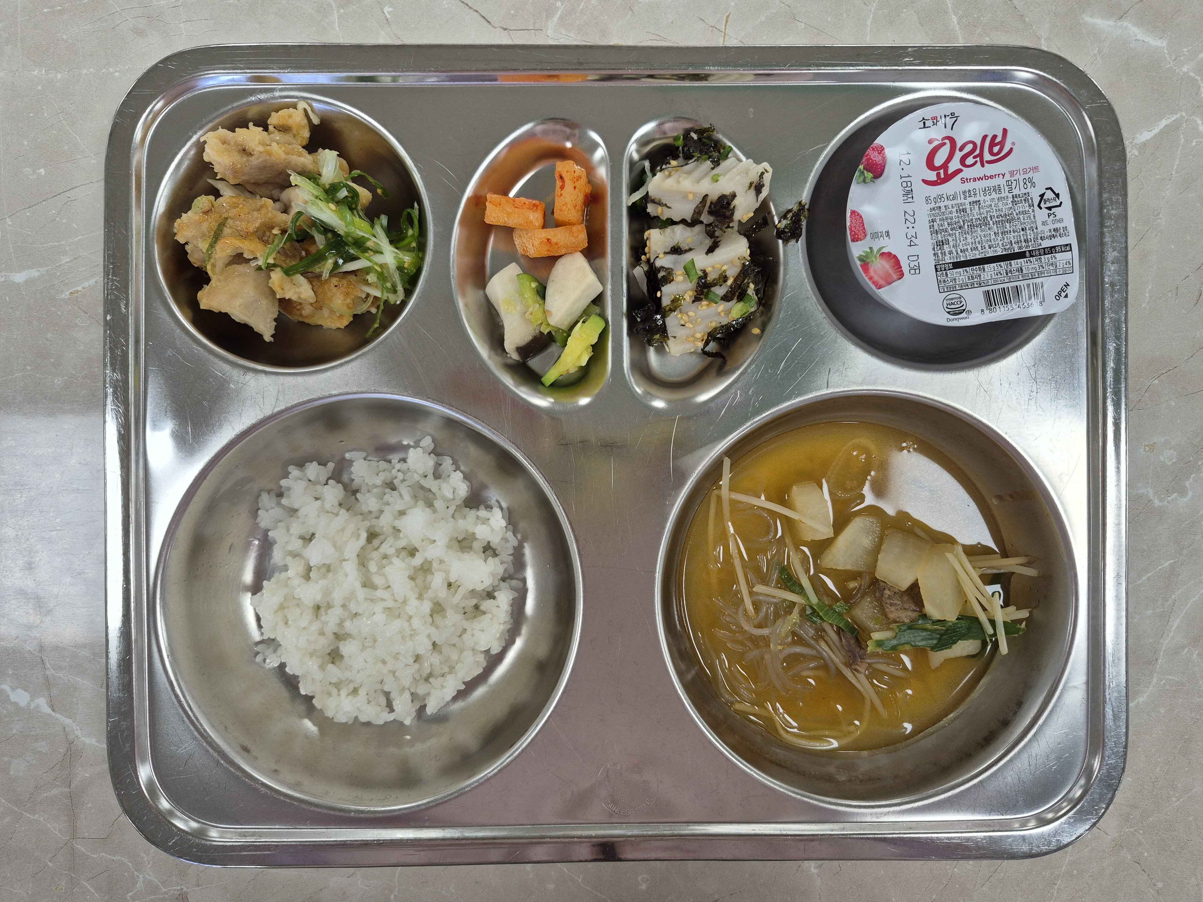 2025년 12월9일 (화) 백리밥상식단(의령의병밥상): 쌀밥, 한우콩나물국, 파닭전, 메밀묵김무침, 애호박새송이볶음(자), 깍두기, 떠먹는요구르트