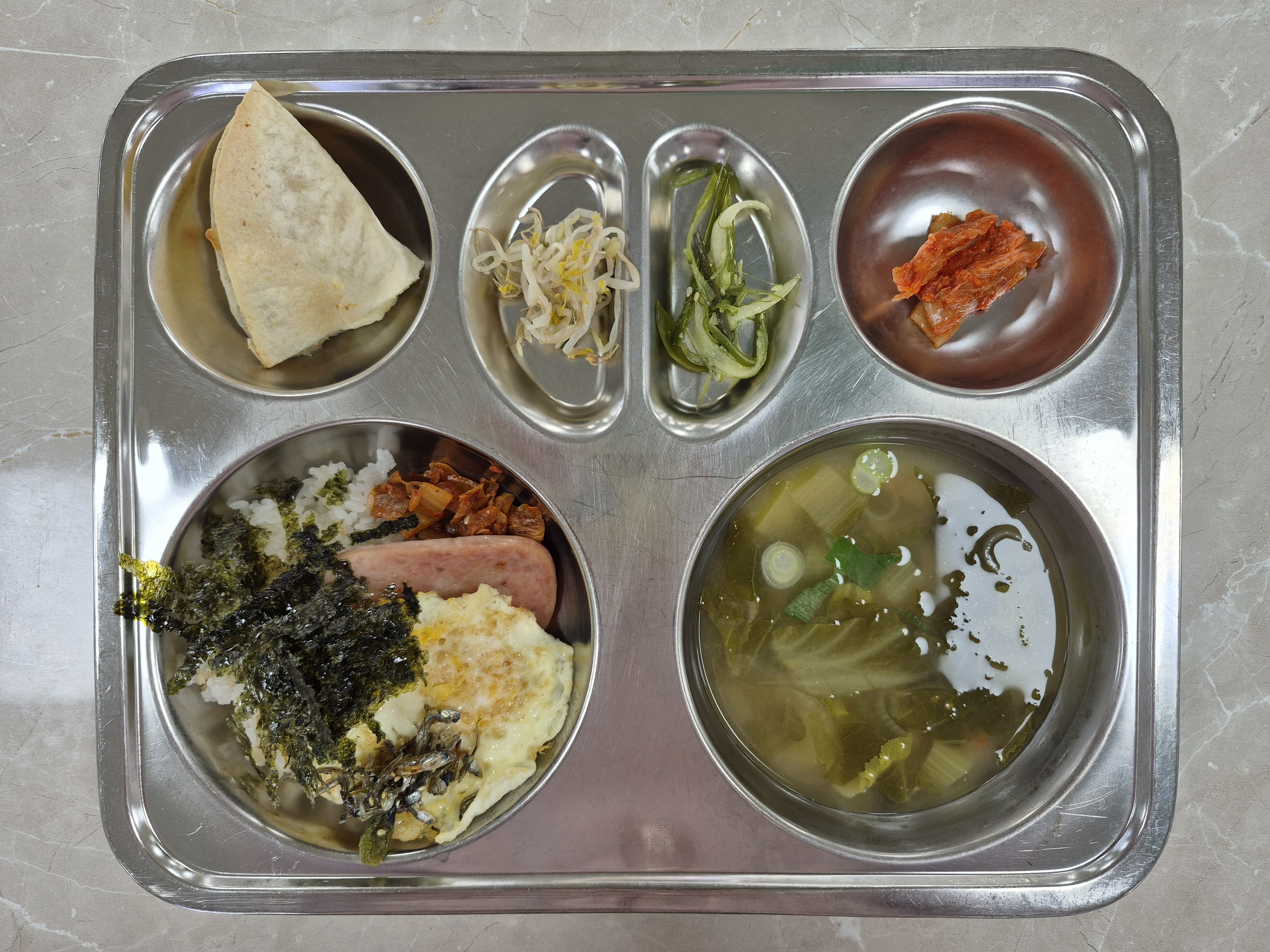 2025년 12월10일 (수) 식단: 옛날도시락, 단배추된장국, 숙주나물무침, 미역줄기볶음(자), 배추김치, 감자또띠아