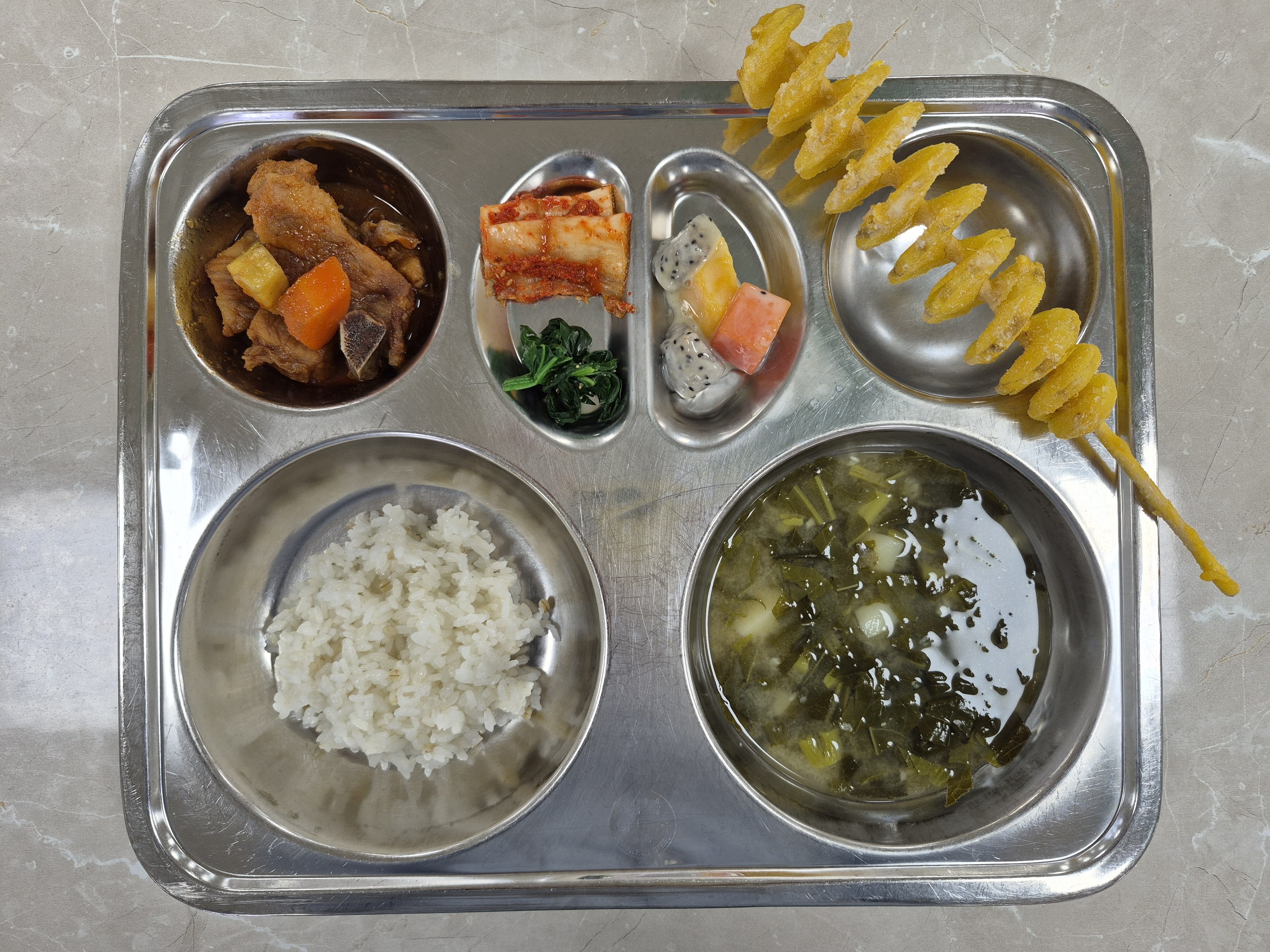 2025년 12월17일 (수) 식단: 찰보리밥, 아욱국, 동인동찜갈비, 열대과일샐러드(자), 시금치나물, 배추김치, 회오리감자