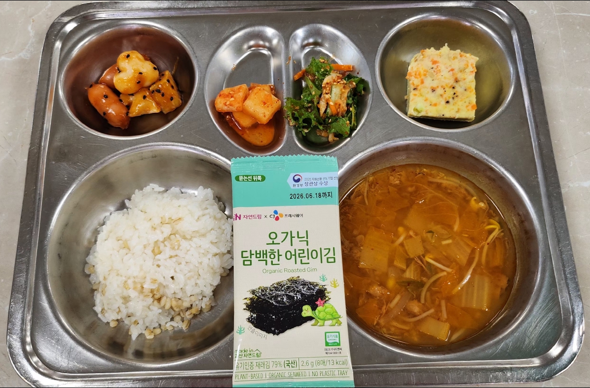 2025년 12월23일 (화) 식단: 찰보리밥, 참치김치찌개, 계란찜, 오븐모듬강정, 모듬야채겉절이, 김구이(친환경), 깍두기