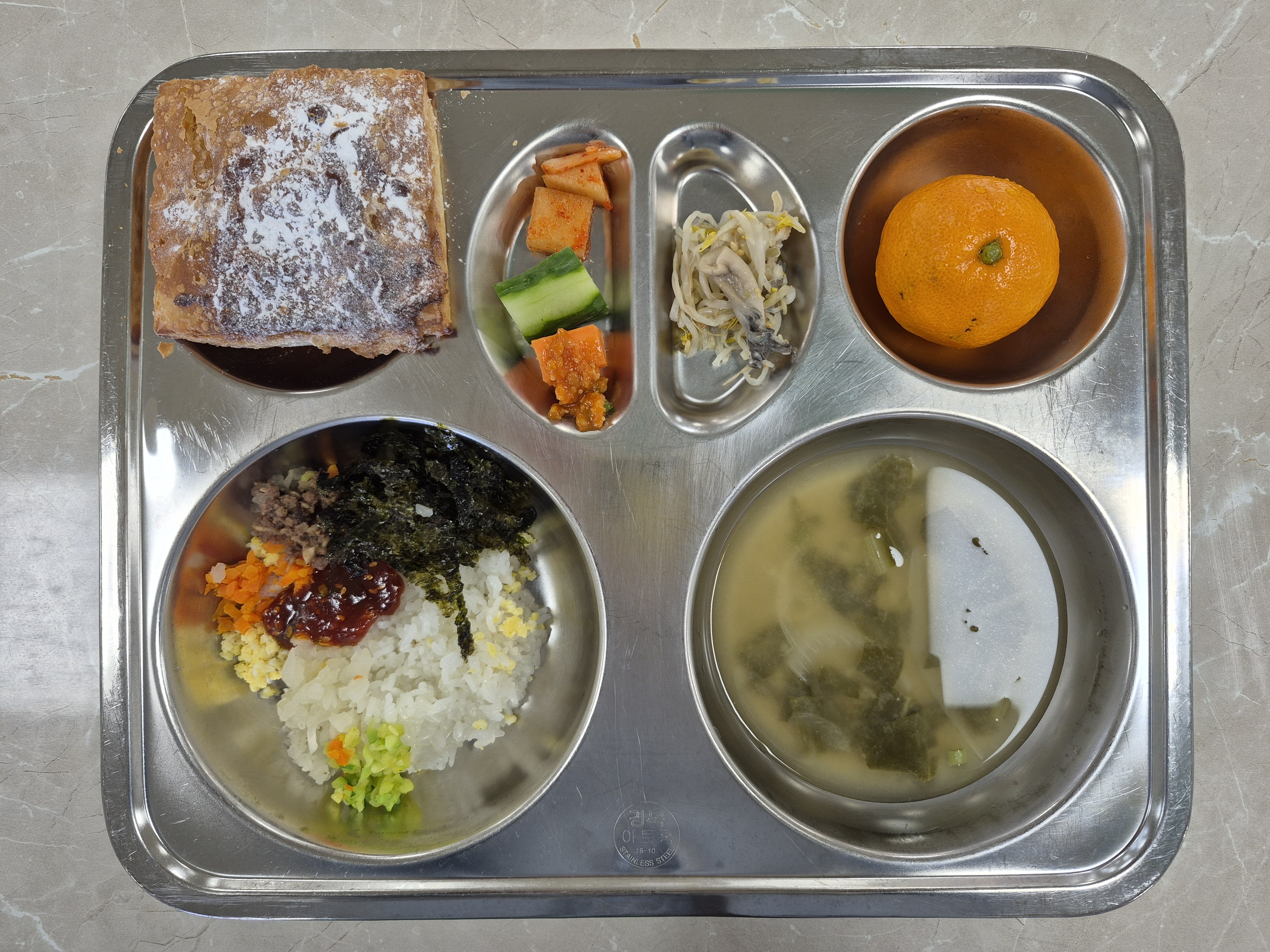 2025년 12월26일 (금) 식단: 소보로비빔밥&약고추장, 근대된장국, 숙주느타리무침, 깍두기, 바사삭슈가페스츄리, 귤, 오이당근스틱(자)