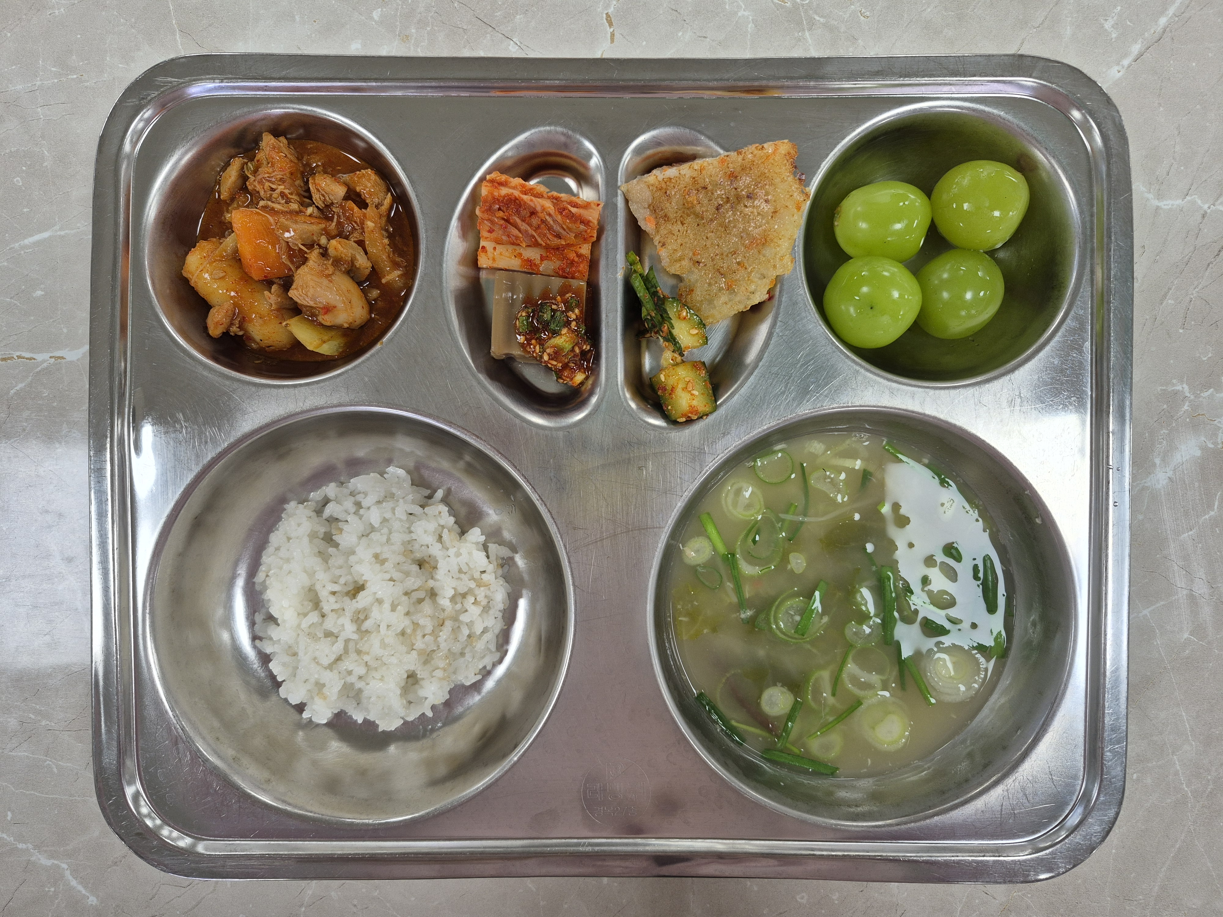 2025년 12월29일 (월) 식단: 발아현미밥, 장어국, 뼈없는닭갈비, 오이소박이, 감자전, 배추김치, 청포도, 도토리묵/양념장(자)