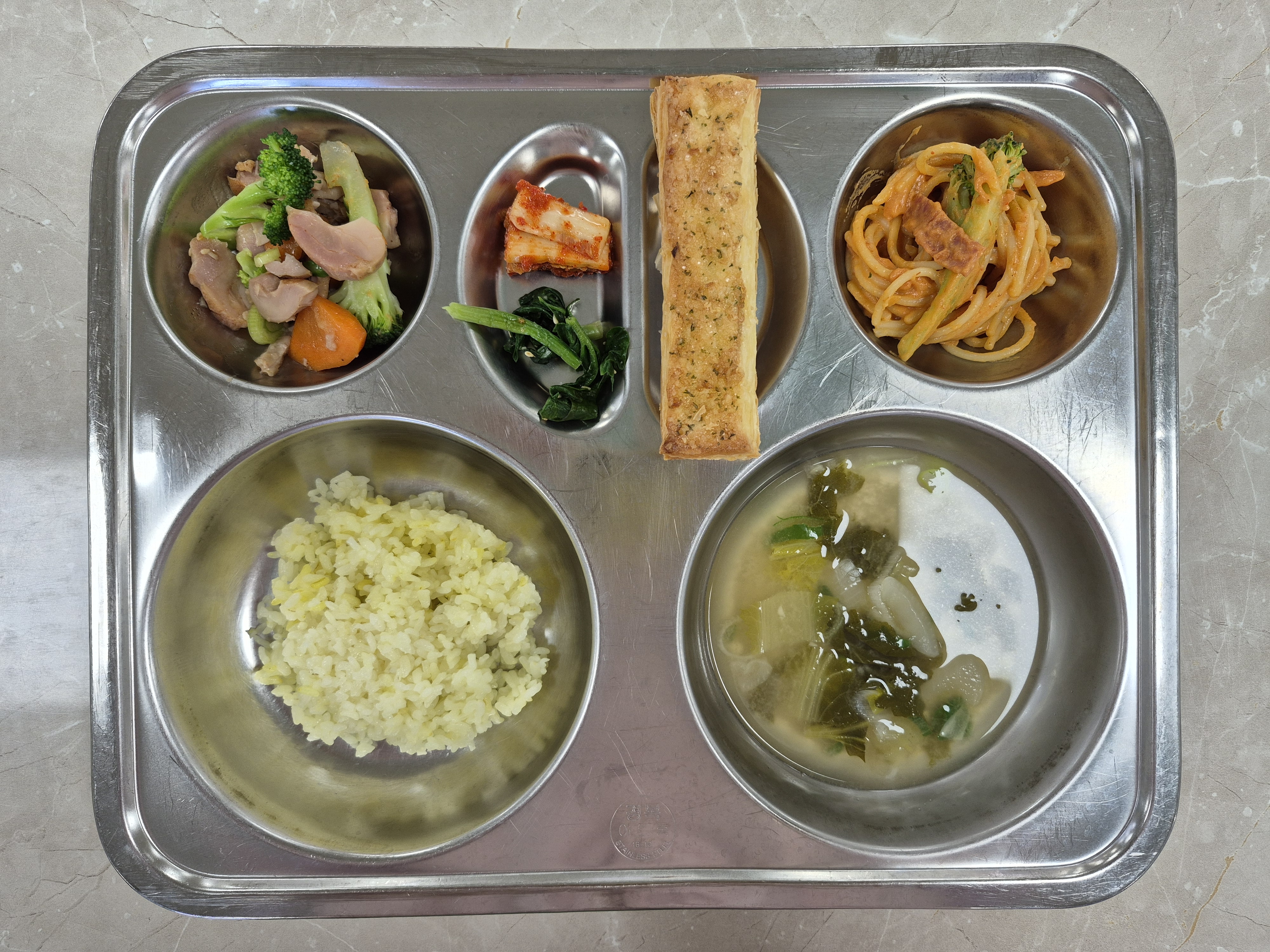 2026년 1월2일 (금) 식단: 강황쌀밥, 단배추된장국, 시금치나물, 훈제닭고기채소볶음, 로제스파게키, 배추김치, 갈릭파이