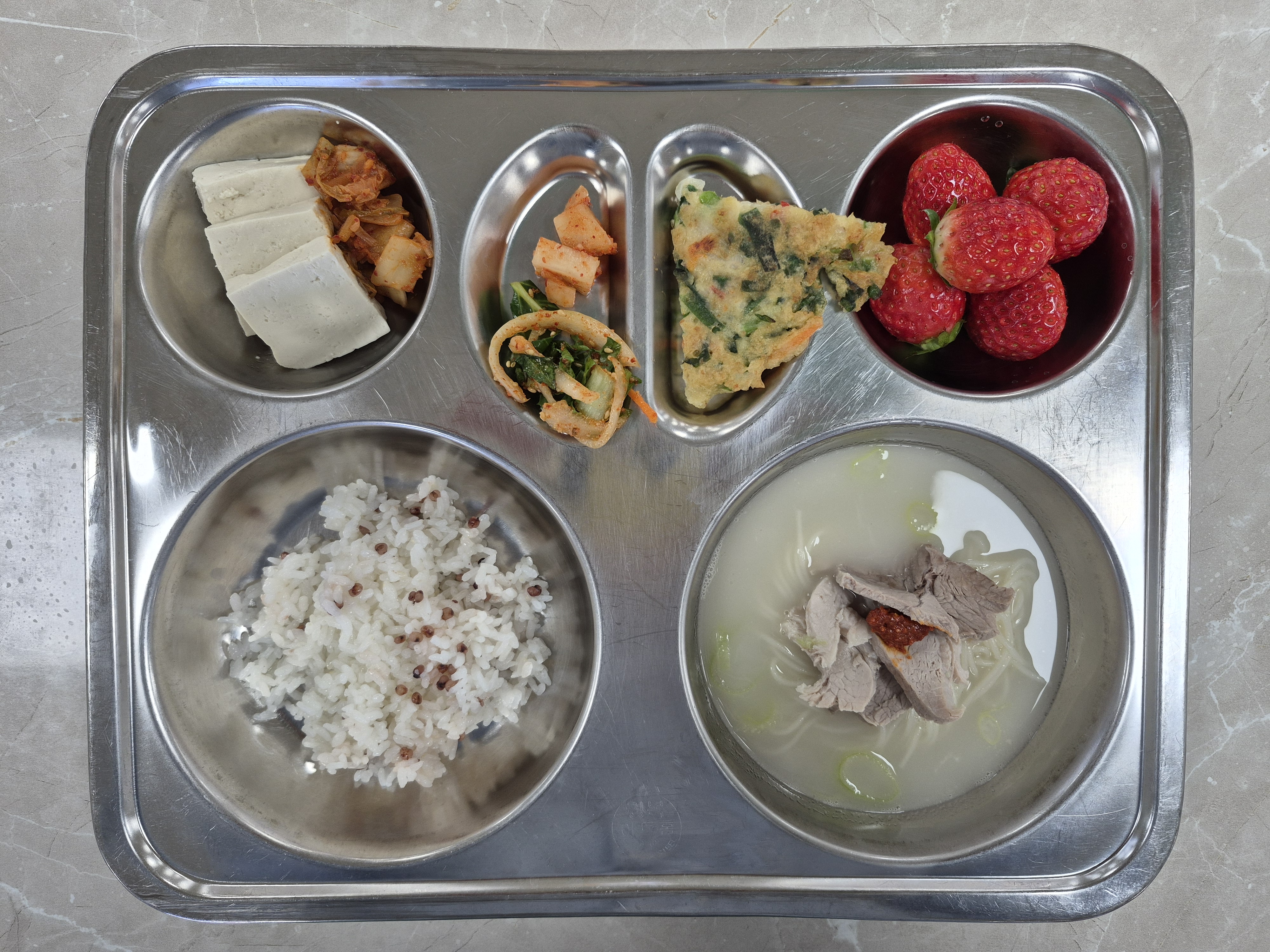 2026년 1월6일 (화) 식단: 차수수밥, 돼지국밥/소면, 모듬야채겉절이, 두부신김치볶음, 부추전, 깍두기, 딸기