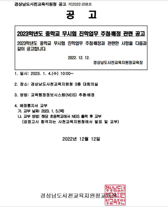 2023학년도 중학교 무시험 진학업무 추첨/배정 관련 공고