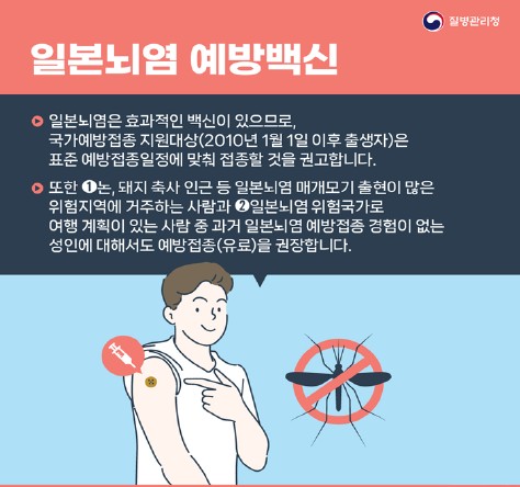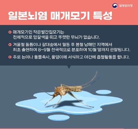 2026년 3월 20일(질병관리청),,제주특별자치도에서 올해 처음으로 일본뇌염 매개모기인' 작은빨간집모기'가 확인됨에 따라 일본뇌염 주의보를 발령하였습니다. 이는 작년 대비 감시 시작을 1주일 앞당긴 결과로 기후변화로 인해 모기 출현 시기가 빨라지는 추세를 반영하고 있습니다. 일본뇌염은 예방 백신이 있는 만큼 접종 대사 아동 및 위험 지역 거주 성인의 예방 접종과 모기 물림 예방 수칙 준수가 필요합니다. 아래 내용을 참고 바랍니다.