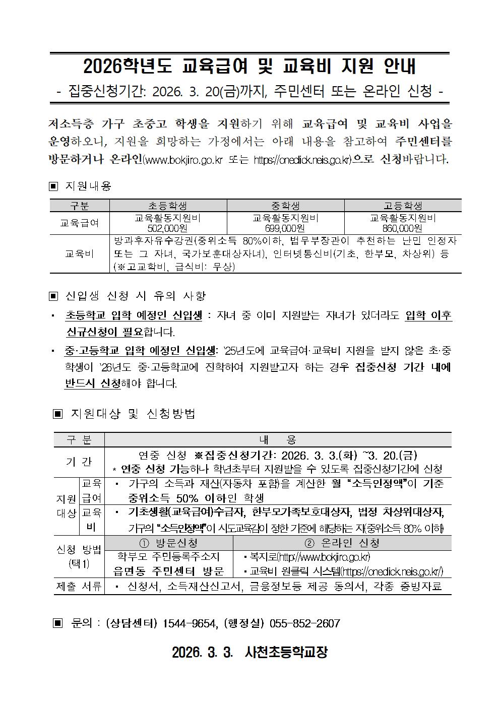 ★신청방법: 주민센터방문 또는 온라인신청 복지로 http://www.bokjiro.go.kr 교육비 원클릭 시스템 https://oneclick.neis.go.kr