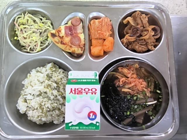 차조밥 도토리묵채국 (5.6.8.9.18)콩나물들깨무침 (5)주꾸미돈육볶음 (5.6.10.13)깍두기 (9)우유(희망) (2)라이스피자 (1.2.5.6.9.10.12.13.15.16.18)