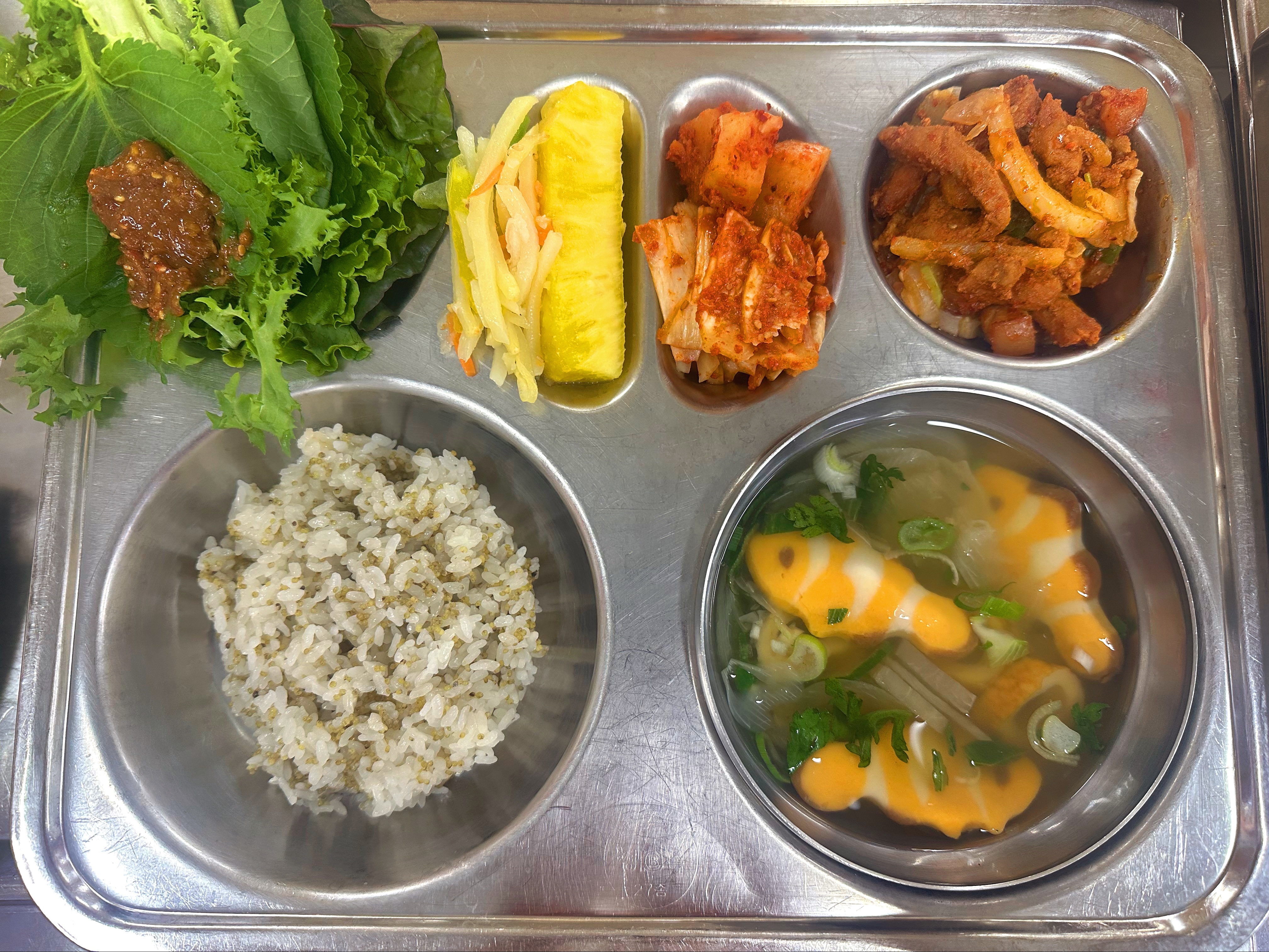 차조밥(초) 모양어묵국(초) (1.5.6.9.13)맵단돈구이(초) (5.6.10.13)파프리카감자채볶음(초) 배추김치 (9.13)우유(희망) (2)파인애플(초) 쌈채소냠냠&쌈장(초)(자율) (5.6.13)