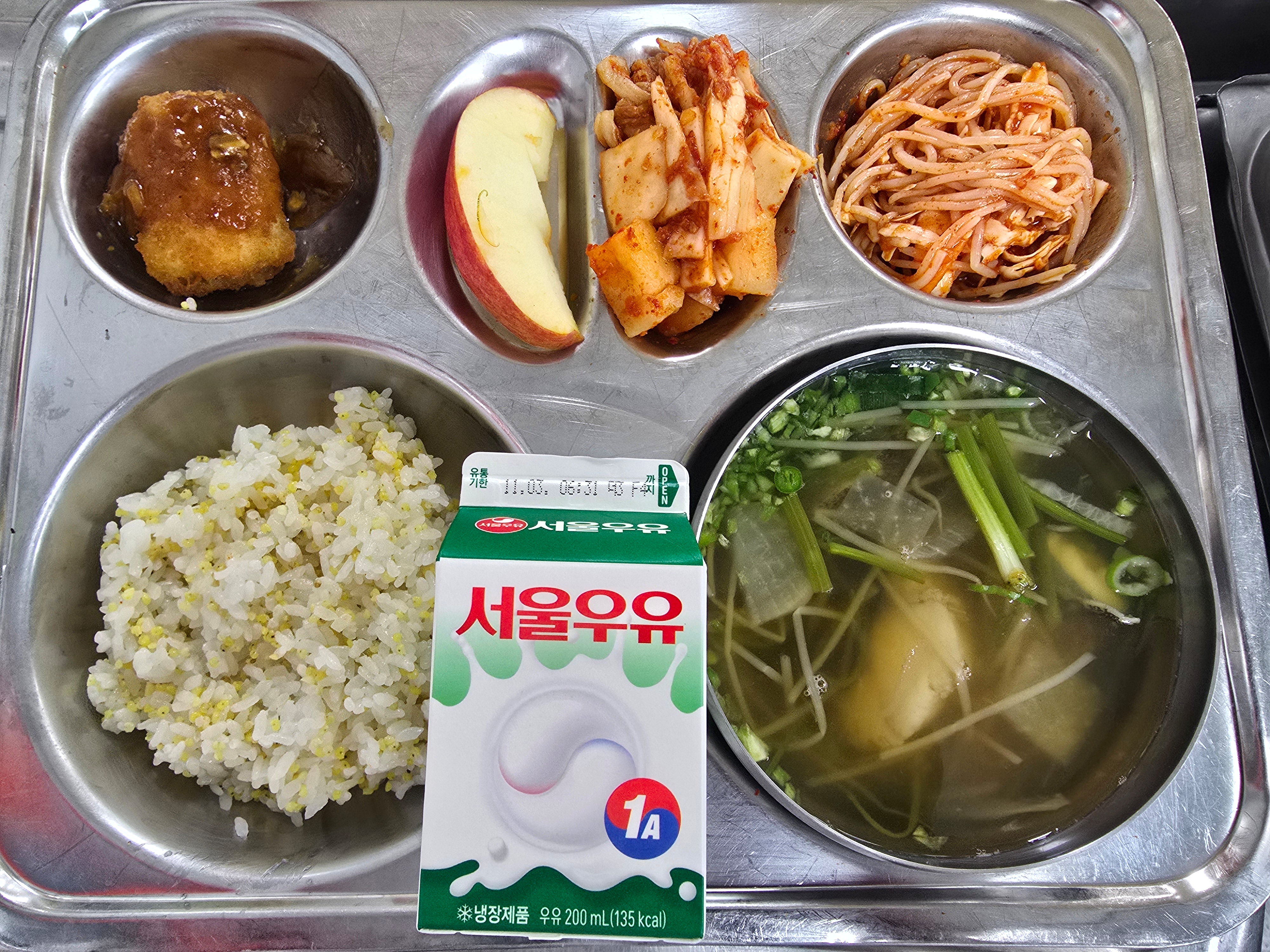 기장밥(초) 대구탕(초) (5)우리쌀쫄면채소무침(초) (5.6.12.13)치즈돈가스(초) (1.2.5.6.10.12.13.18)깍두기(초) (9)우유(희망) (2)조각사과(초) (13)