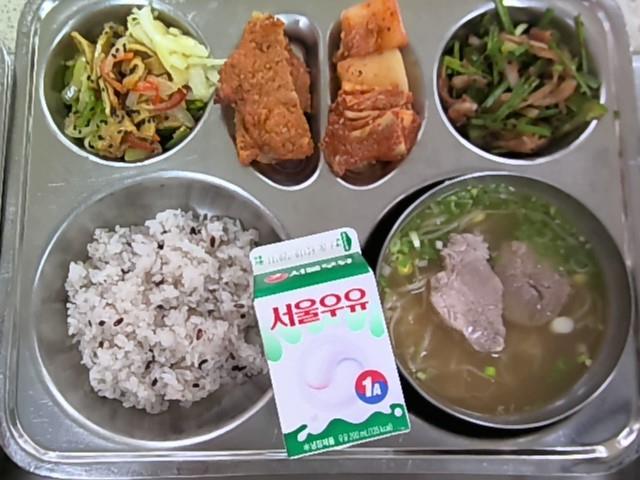 오징어김치전(초) (1.6.9.13.17)오이부추무침(초) (5.6.13)어묵채소볶음(초) (1.5.6.13.18)섞박지(초) (9)우유(희망) (2)