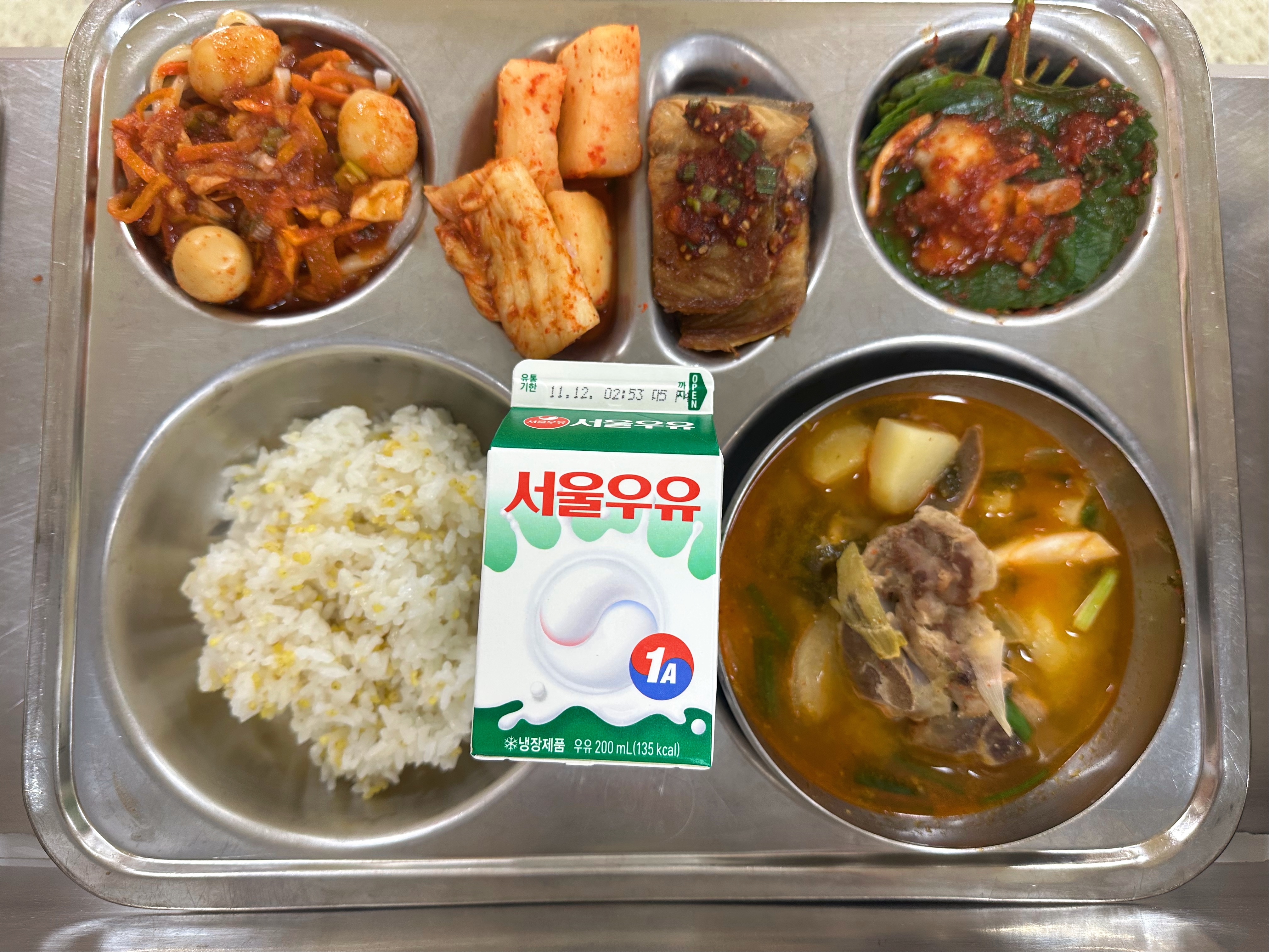 기장밥(초) 돈등뼈탕(초) (9.10)수제깻잎지(자율) (13)우동볶이(초) (1.5.6.13)고등어구이&양념장(초) (5.6.7.13)섞박지(초) (9.13)우유(희망) (2)