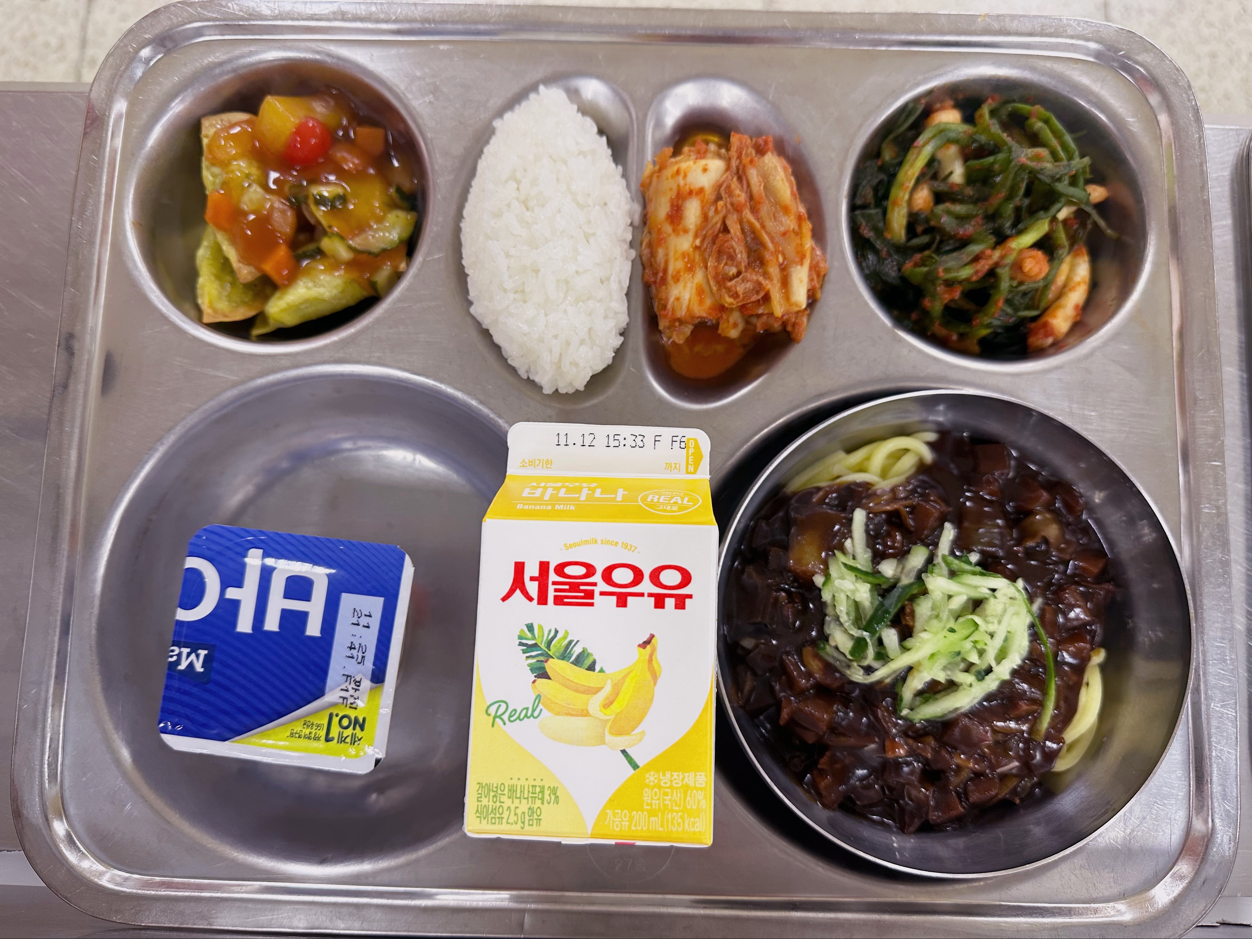 자장면(초) (5.6.10.13.16)만두탕수(초) (1.5.6.10.11.12.13.16.18)파김치(자율) (9.13)우유(희망) (2)떠먹는발효유(초) (2)자율배식(쌀밥)