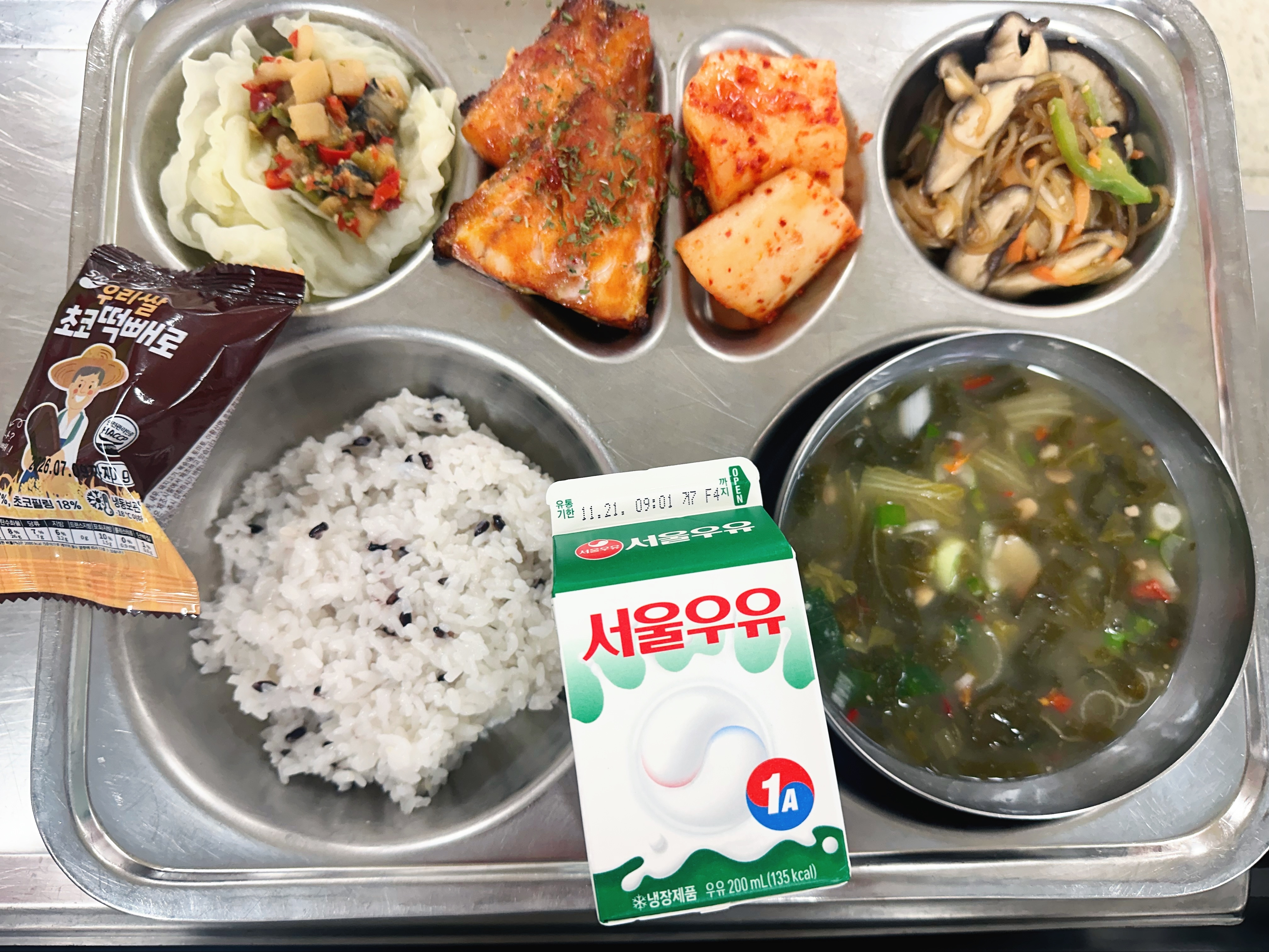 흑미밥(초) 단배추된장국(초) (5.6.9.18)양배추찜/우렁쌈장(자율) (5.6)버섯잡채(초) (5.6.13)장문볼락스테이크(초) (6)총각김치(초) (9)우유(희망) (2)초코떡빼로(초) (2.5.6)