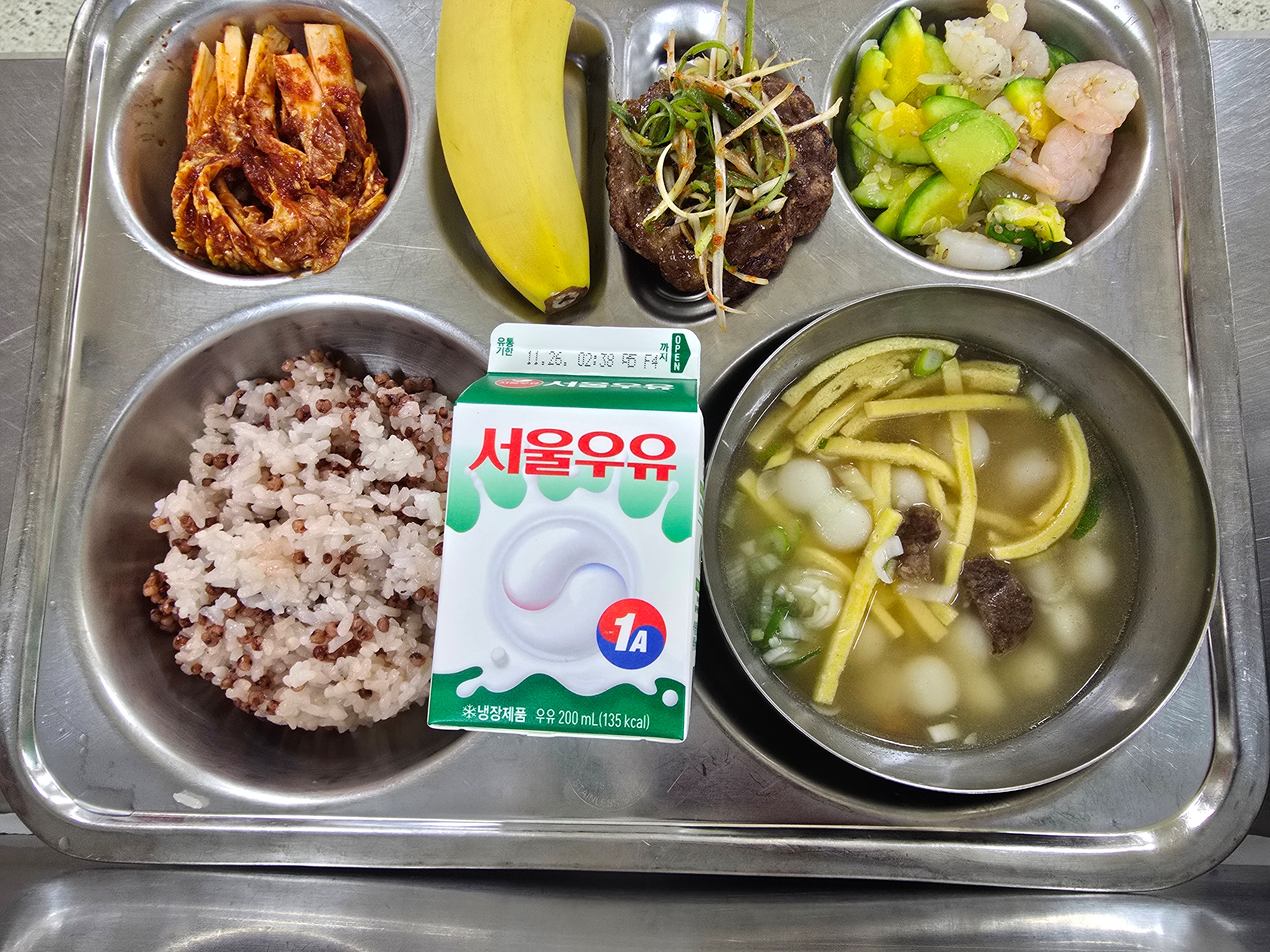 수수밥(초) 조랭이떡국(초) (1.9.16)애호박새우살볶음(초) (9.13)너비아니&파채구이(초) (5.6.10.13.15.16.18)배추김치담그는날 (9.13)우유(희망) (2)바나나(초)