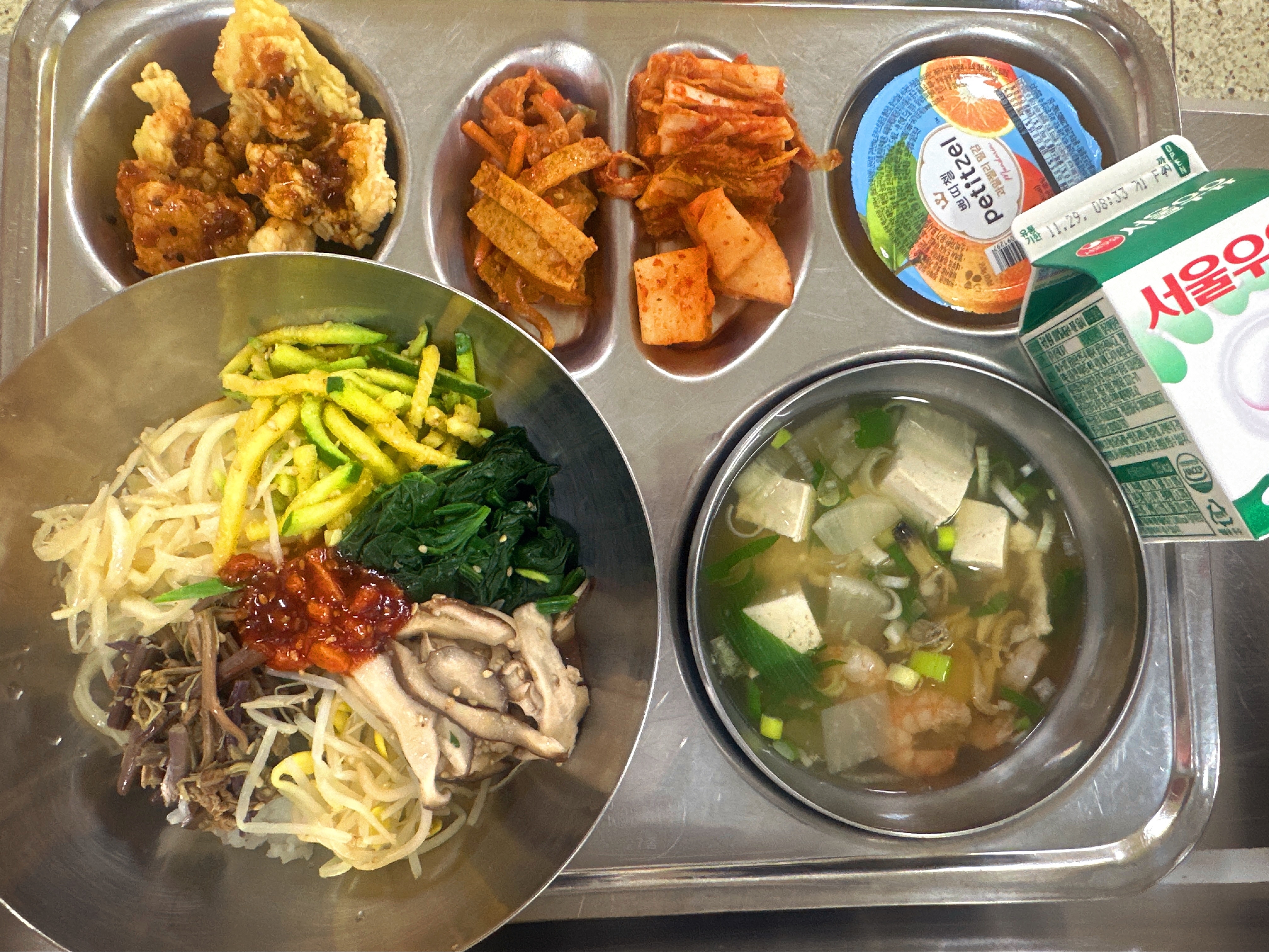 건강비빔밥*약고추장(초) (5.6.16)두부탕국(초) (5.9.13.17.18)어묵채소볶음(초) (1.5.6.13.18)장어강정 (5.6.13)배추김치 (9.13)우유(희망) (2)밀감푸딩
