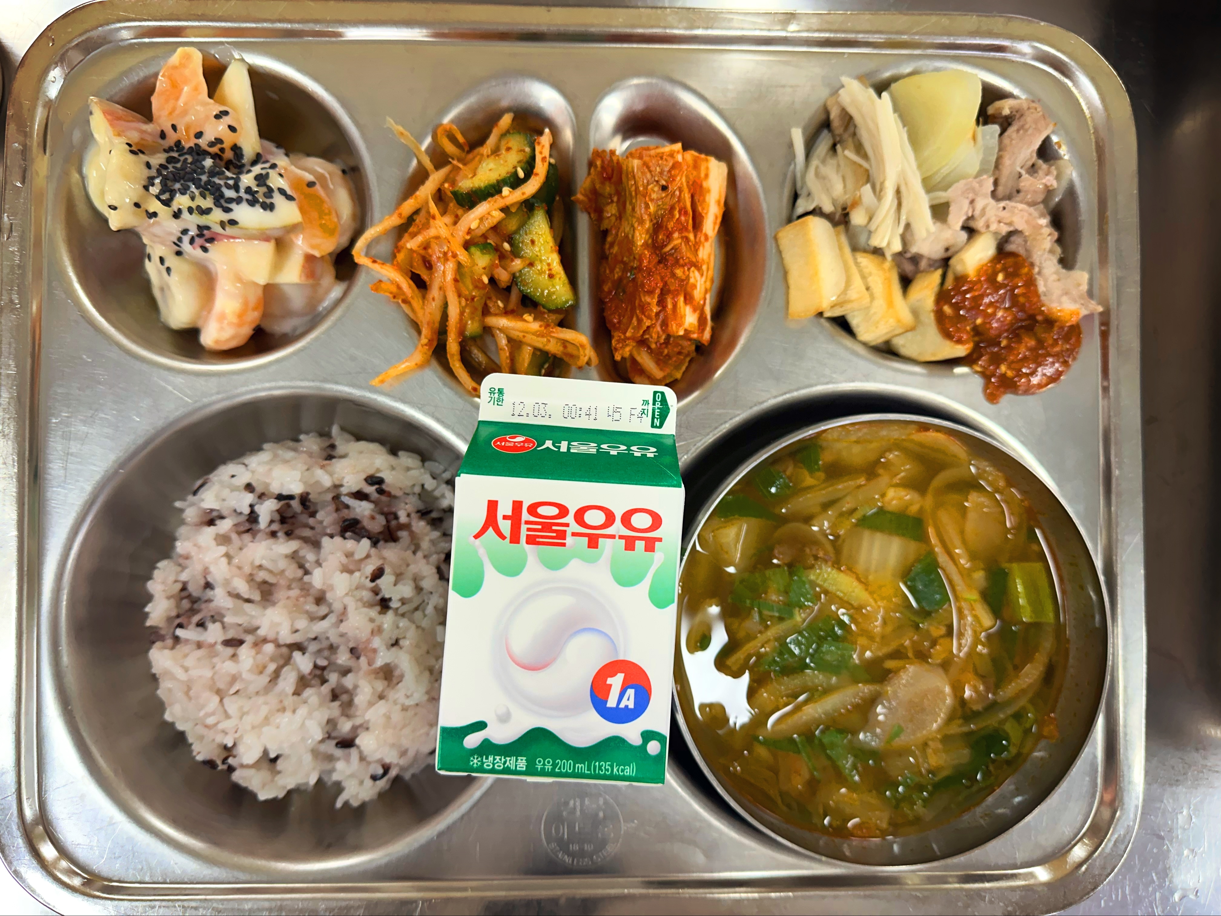 흑미밥(초) 황토한우우거지국(초) (5.6.16)오이도라지무침(초) (5.6.13)대패삼겹&채소구이(초) (5.6.10.13)배추김치(초) (9.13)우유(희망) (2)겨울과일샐러드 (2)