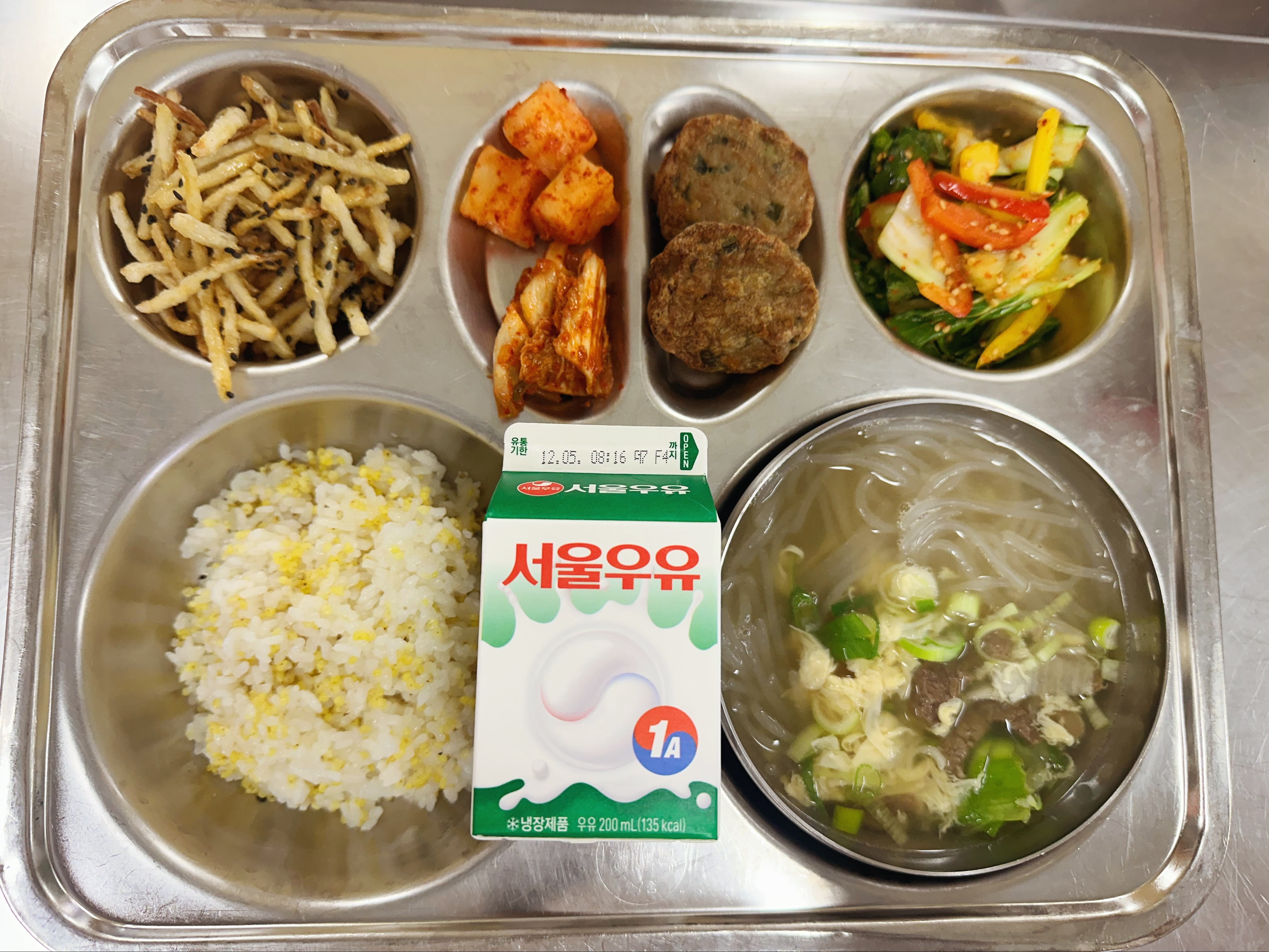 기장밥(초) 쇠고기당면국(초) (1.5.6.9.16)청경채겉절이(초) 육원전(초) (1.2.5.6.10.15.16)우엉채맛탕(초) (13)깍두기(초) (9)우유(희망) (2)