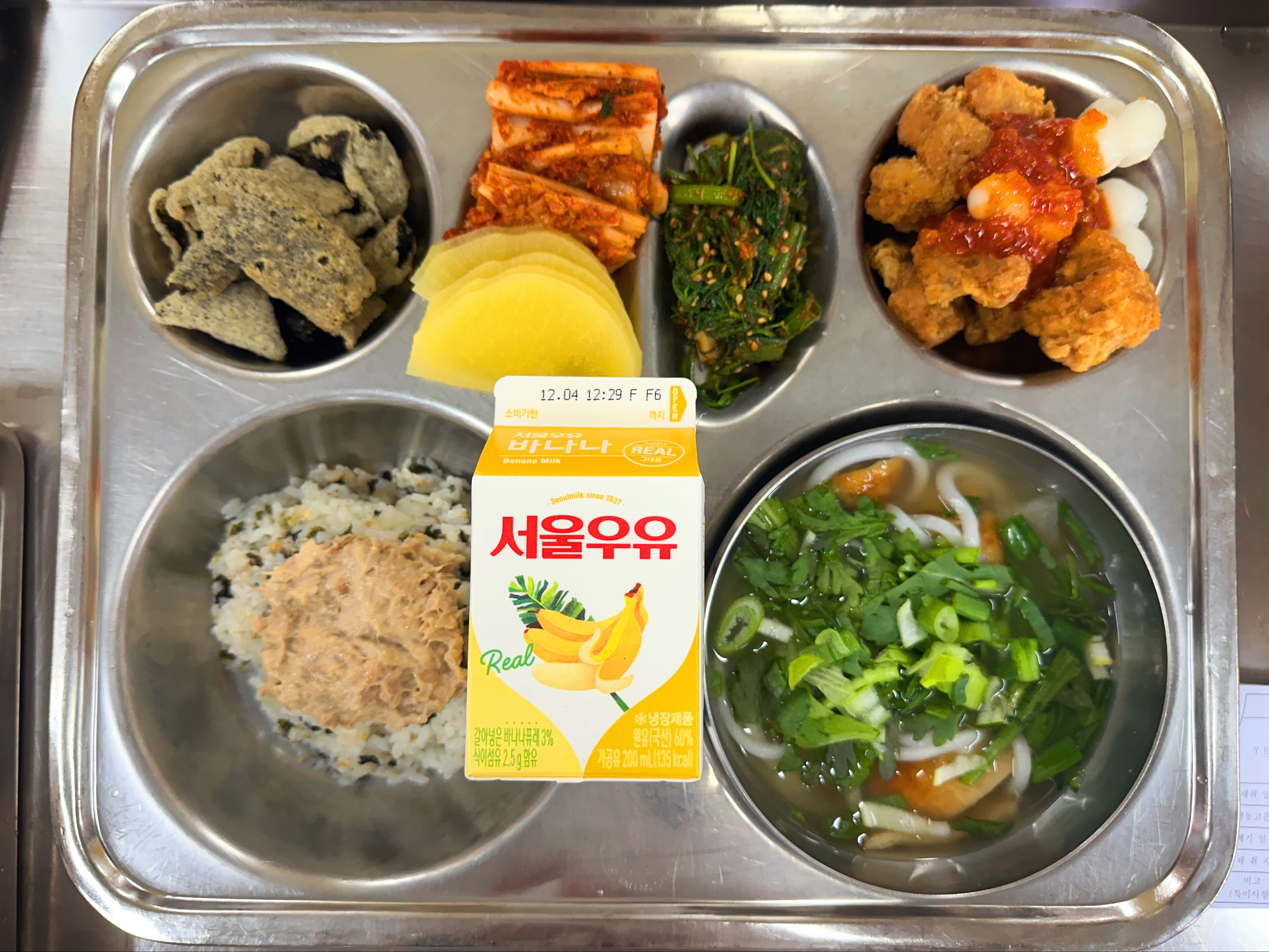 김가루밥&참치마요S (1.5)쌀우동(초) (1.2.5.6.7.9.18)고춧잎나물(자율)(초) (5.6.13)모듬김부각(초) (5.6)반반치킨(초) (5.6.12.13.15)배추김치(초) (9.13)단무지(초) 우유(희망) (2)