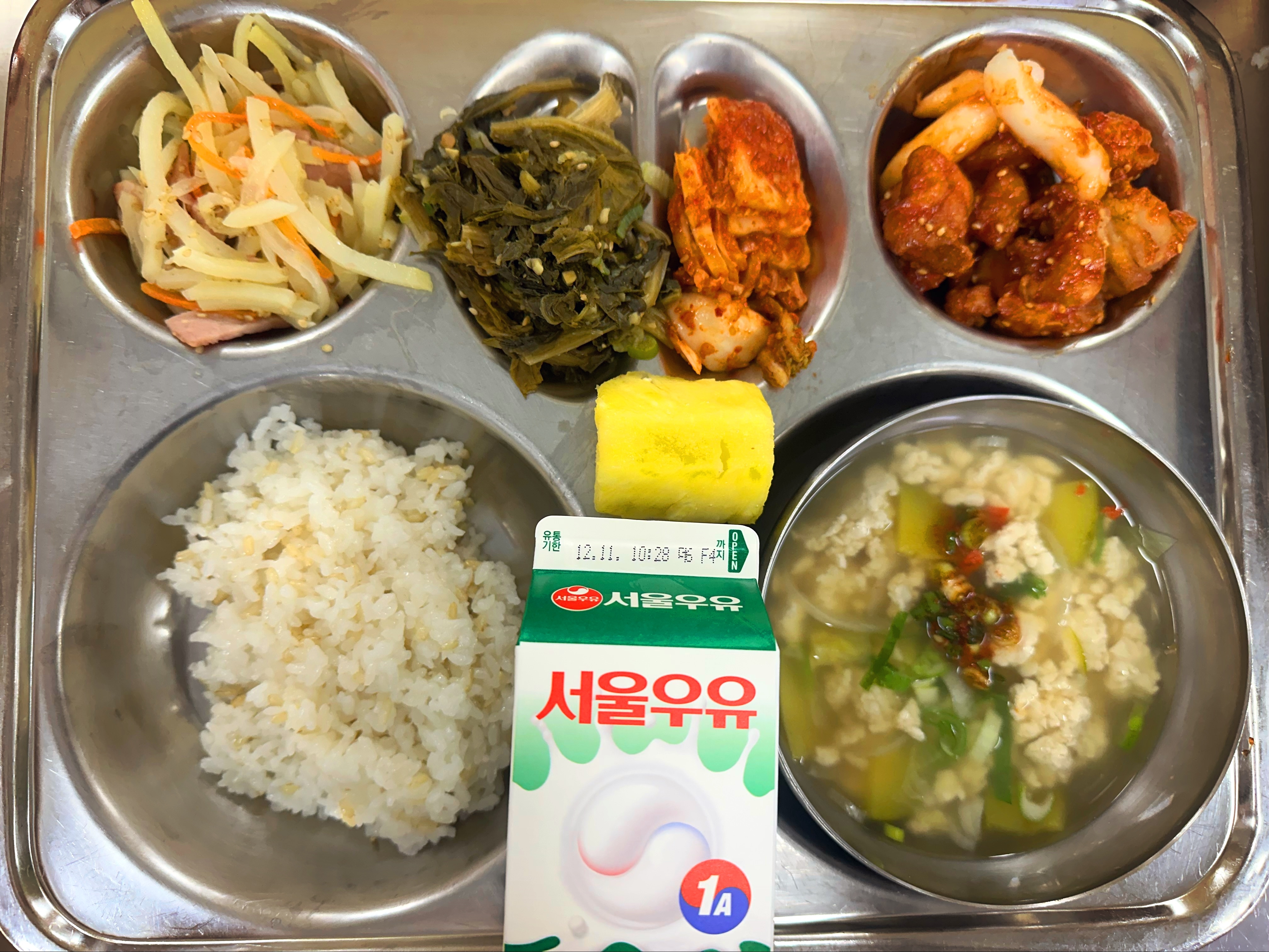 찹쌀현미밥(초) 초당순두부&양념장(초) (5.6.9)시래기된장조림(자율) (5.6)베이컨감자채볶음(초) (10)양념닭강정 (5.6.12.13.15)배추김치(초) (9.13)우유(희망) (2)파인애플(초)