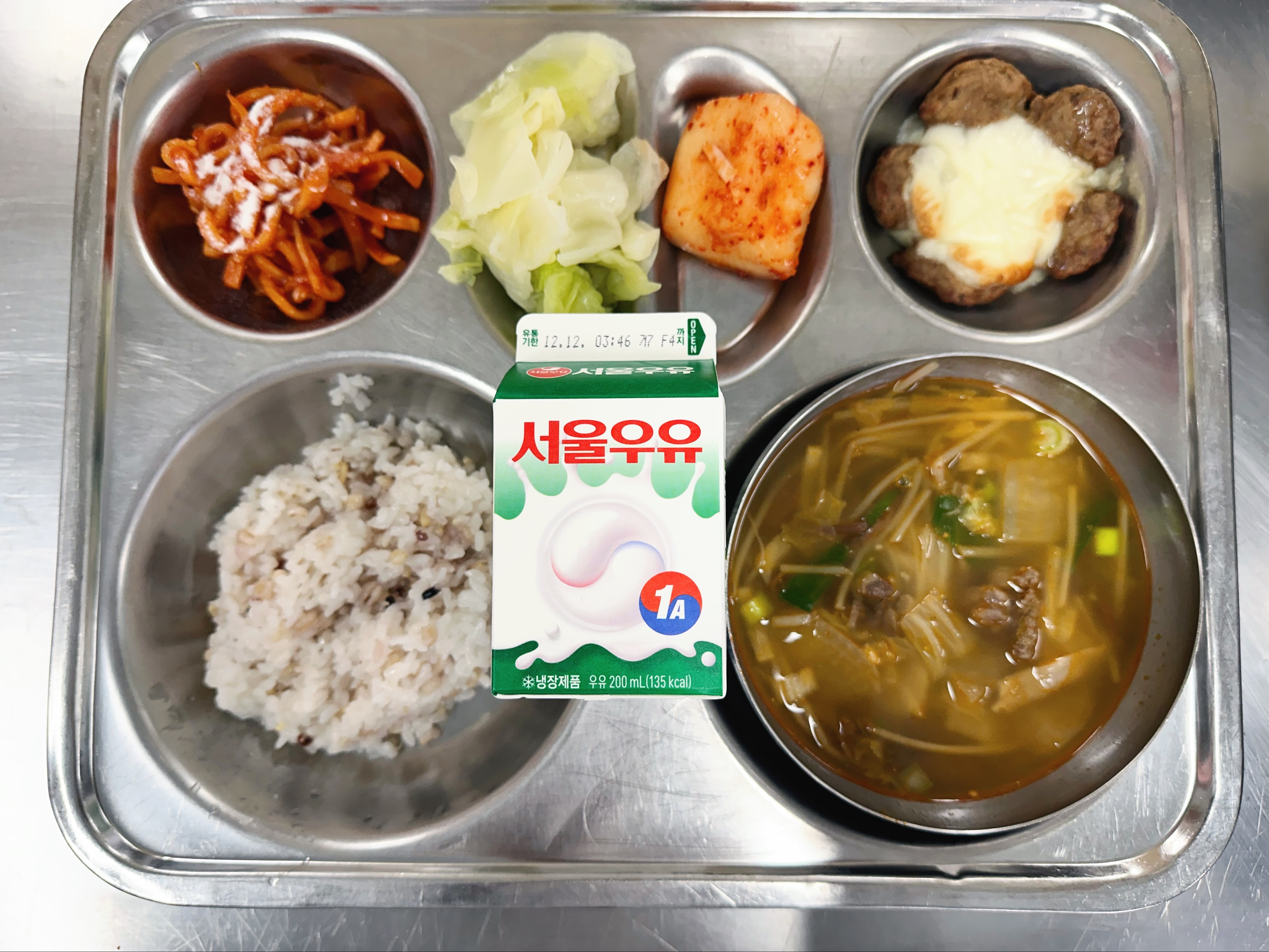 혼합잡곡밥(초) (5)육개장(초) (5.6.16)양배추숙쌈(초) (5.6.13)허니버터진미채볶음 (2.5.6.13.17)꽃모양떡갈비 (5.6.10.15.16.18)총각김치(초) (9)우유(희망) (2)