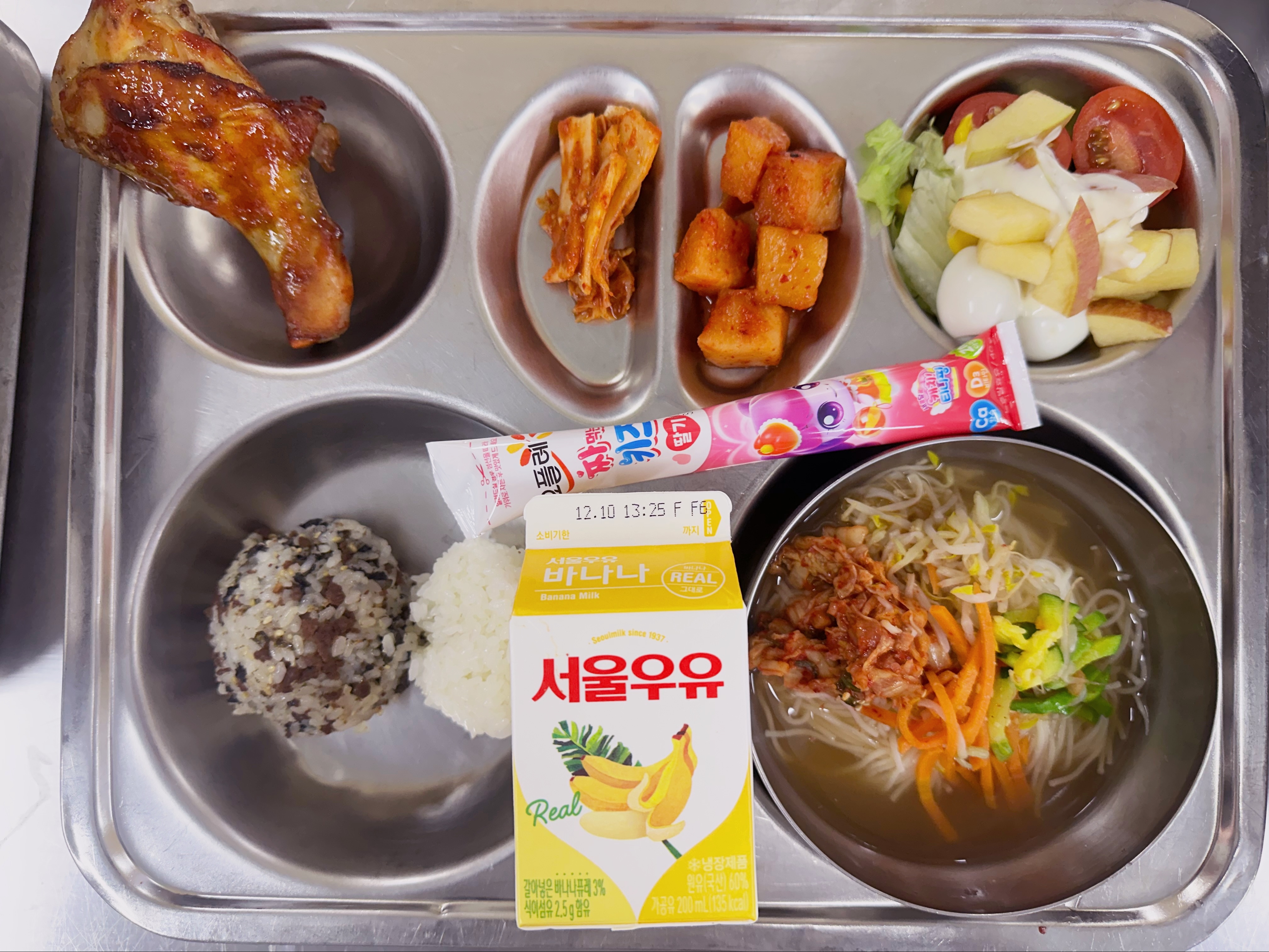 쇠고기김가루주먹밥 (16)잔치국수(초) (6.8.9.18)사과콥샐러드 (1.2.5.12.13)바베큐닭다리치킨스테이크(초) (2.5.6.13.15)깍두기(초) (9)우유(희망) (2)짜먹는 요구르트 (2)