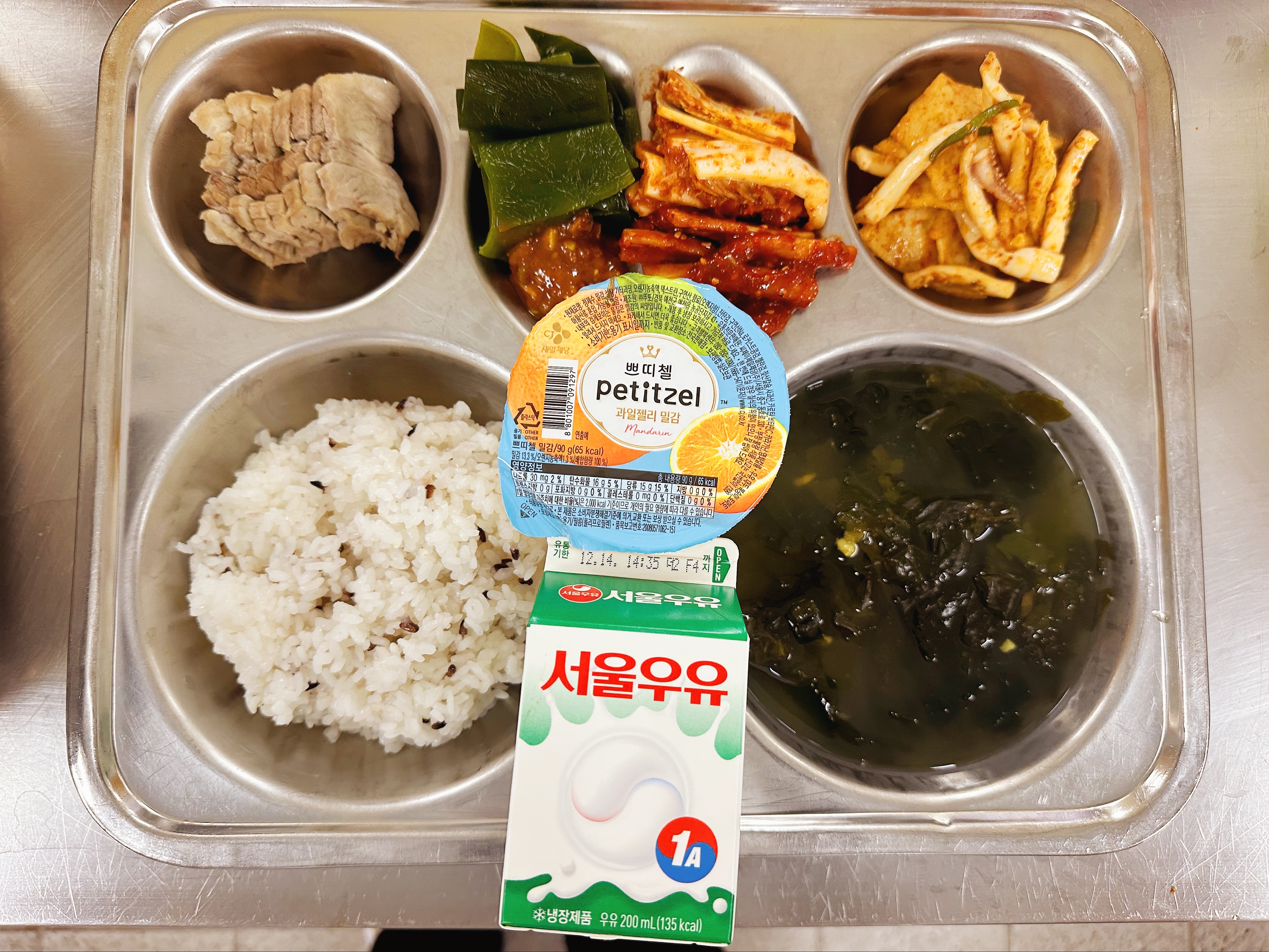 흑미밥(초) 대합살미역국(초) (5.6.9.18)수육보쌈&무말랭이지(초) (5.6.10.13)오징어어묵무침 (1.5.6.13.17)배추김치(초) (9.13)우유(희망) (2)자율배식(다시마쌈) (5.6.13)과일젤리