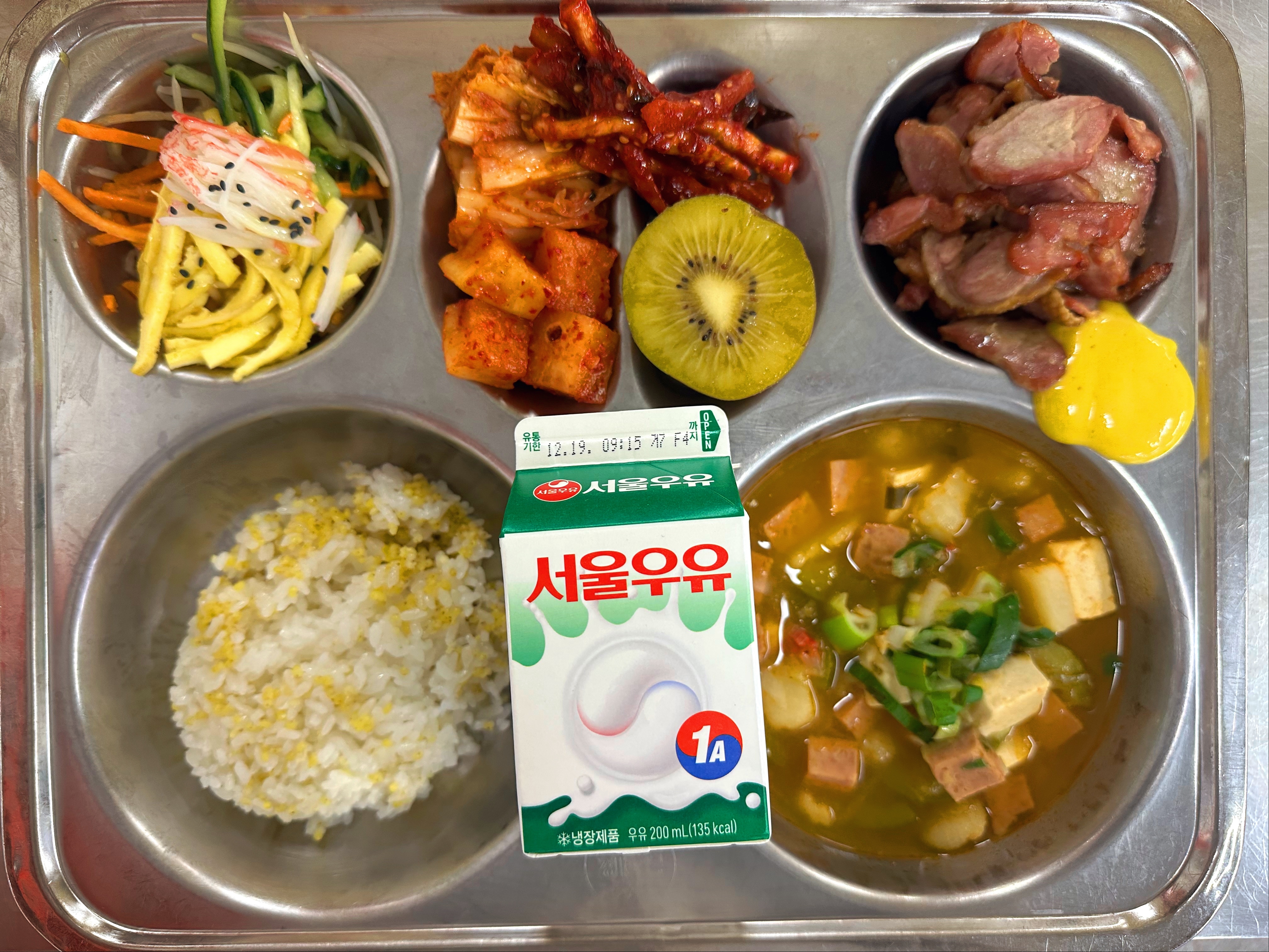 기장밥(초) 애호박고추장찌개(초) (1.2.5.6.10.15.16.18)오색겨자냉채(초) (1.2.5.6.8.13)훈제오리구이 깍두기(초) (9)우유(희망) (2)골드키위1/2(초)