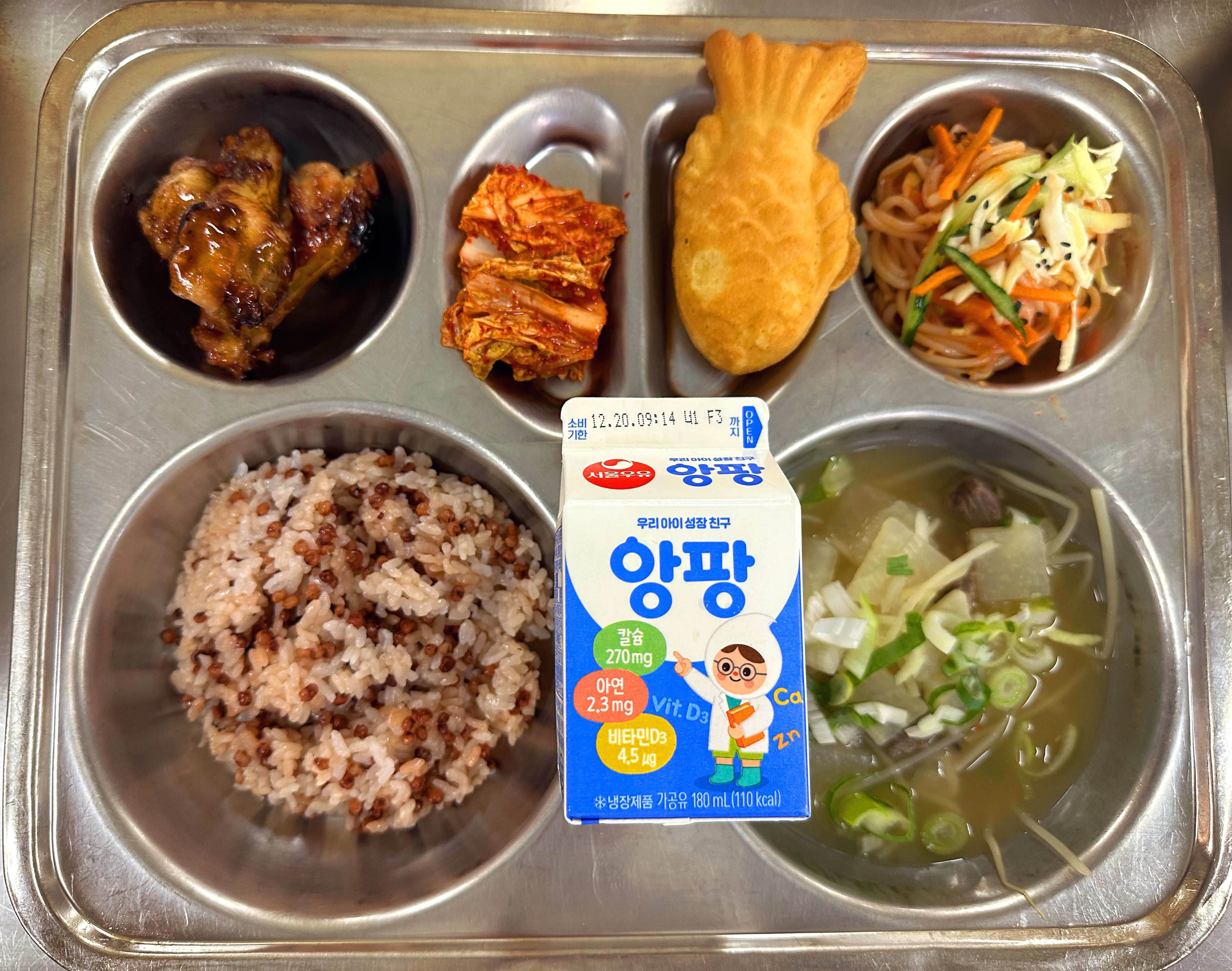 수수밥(초) 쇠고기무국 (5.16)우리쌀쫄면채소무침(초) (5.6.12.13)닭봉양념구이(초) (5.6.13.15)배추김치(초) (9.13)우유(희망) (2)붕어빵 (1.2.5.6)