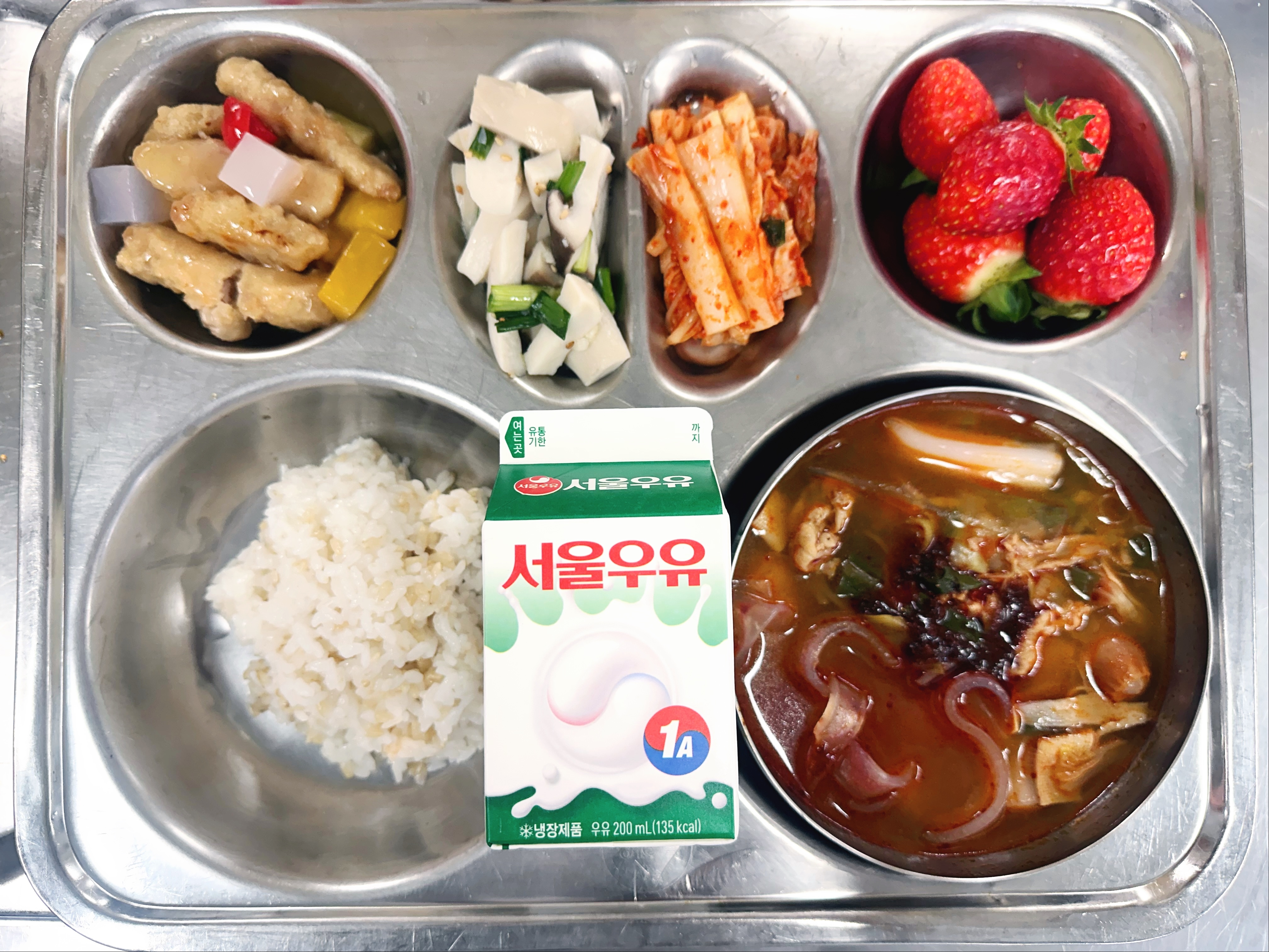 찹쌀현미밥(초) 한국식마라탕(초) (2.5.6.9.10.13.15.16.17.18)새송이버섯초무침(초) (5.6.13)오븐탕수육(초) (1.5.6.10.11.12)배추김치(초) (9.13)우유(희망) (2)딸기(초)