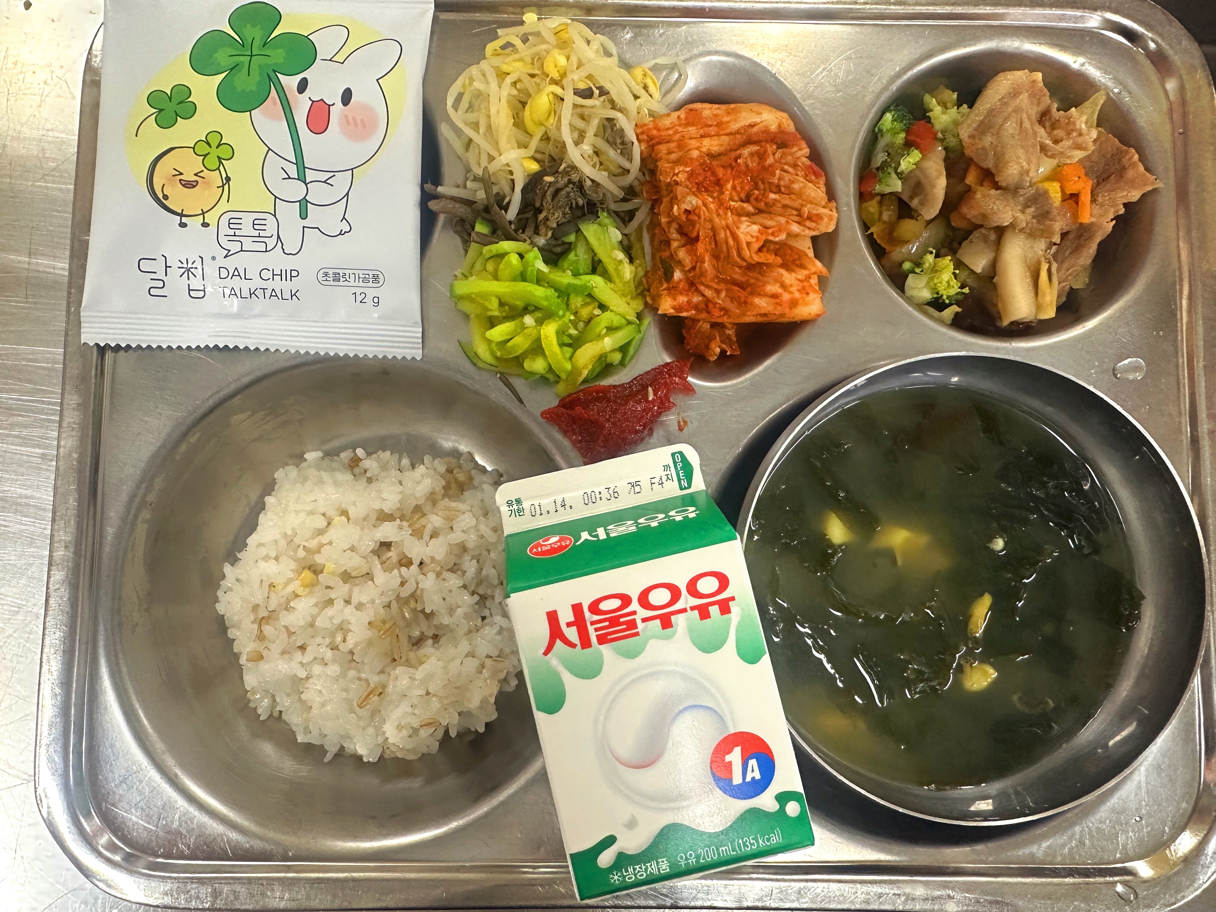혼합잡곡밥(초) (5)전복살미역국 (5.6.9.18)삼색나물&비빔장(초) (5.6.13)찹스테이크 (5.6.13.16.18)배추김치(초) (9.13)우유(희망) (2)유기농쌀과자 (1.2.5.6)