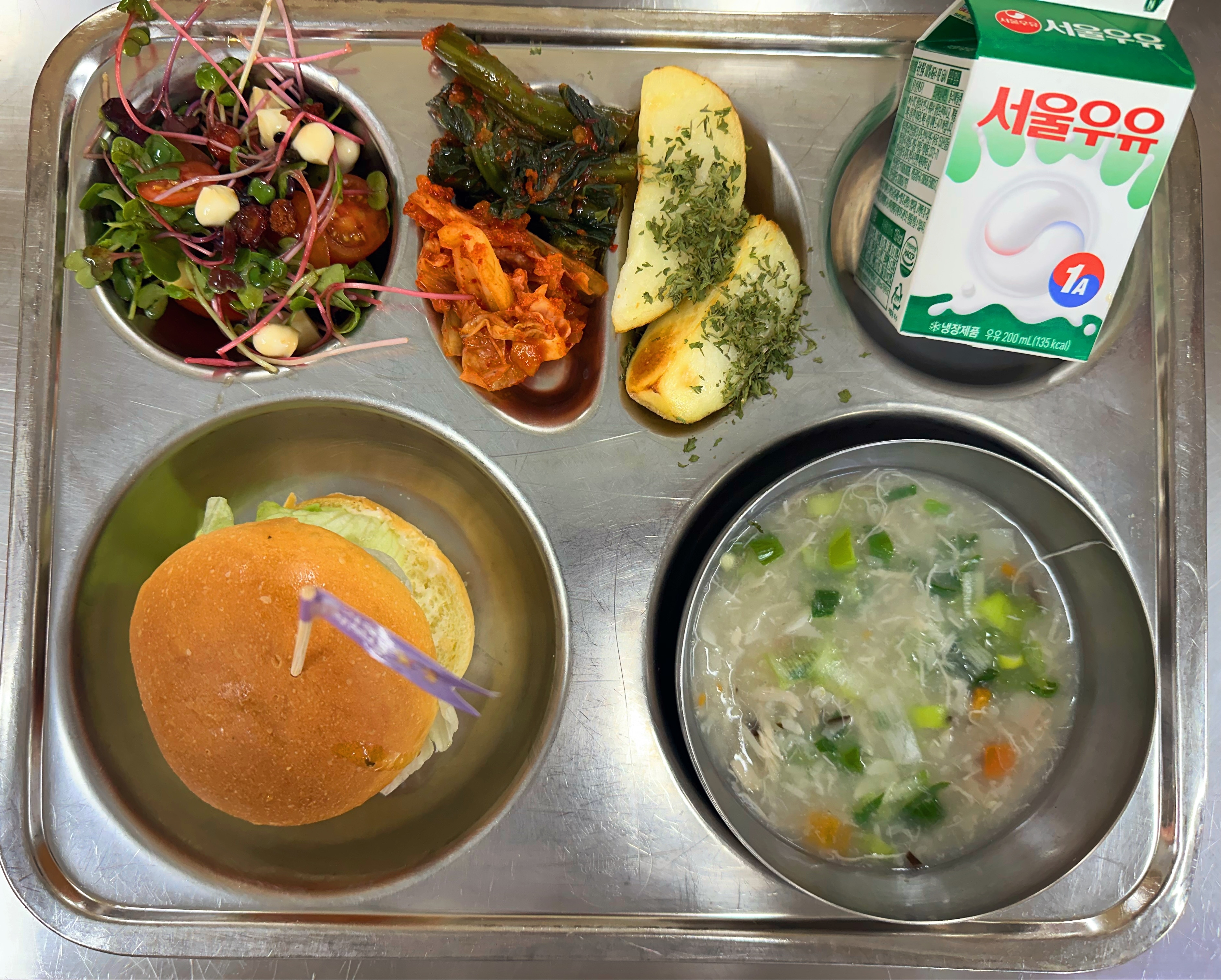 브리오슈수제버거(초) (1.2.5.6.10.12.13.15.16)영양닭죽 (15)방울토마토보코치니샐러드 (2.5.6.12.13)웨지감자(오븐)(초) 배추김치(자율) (9.13)우유(희망) (2)