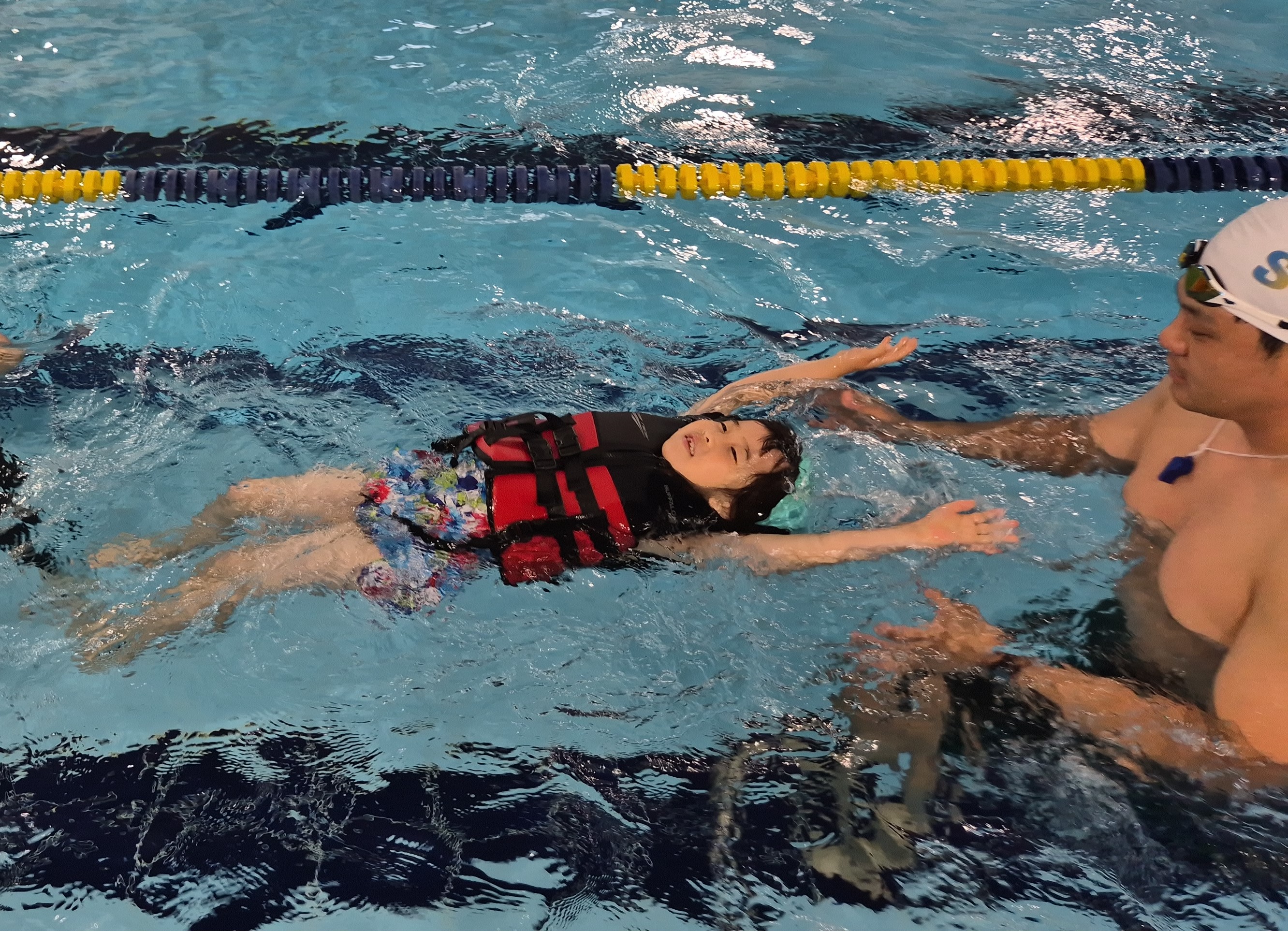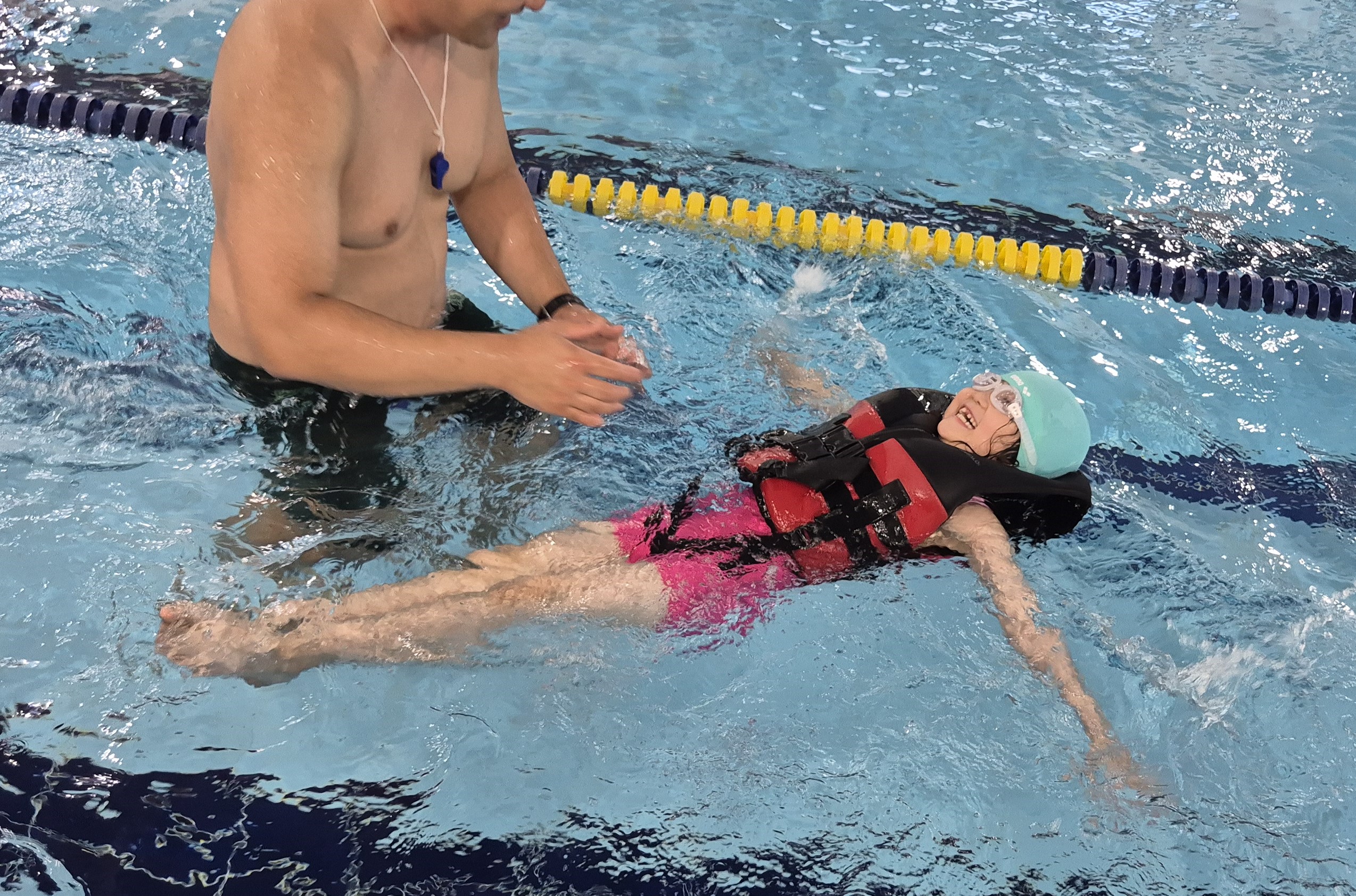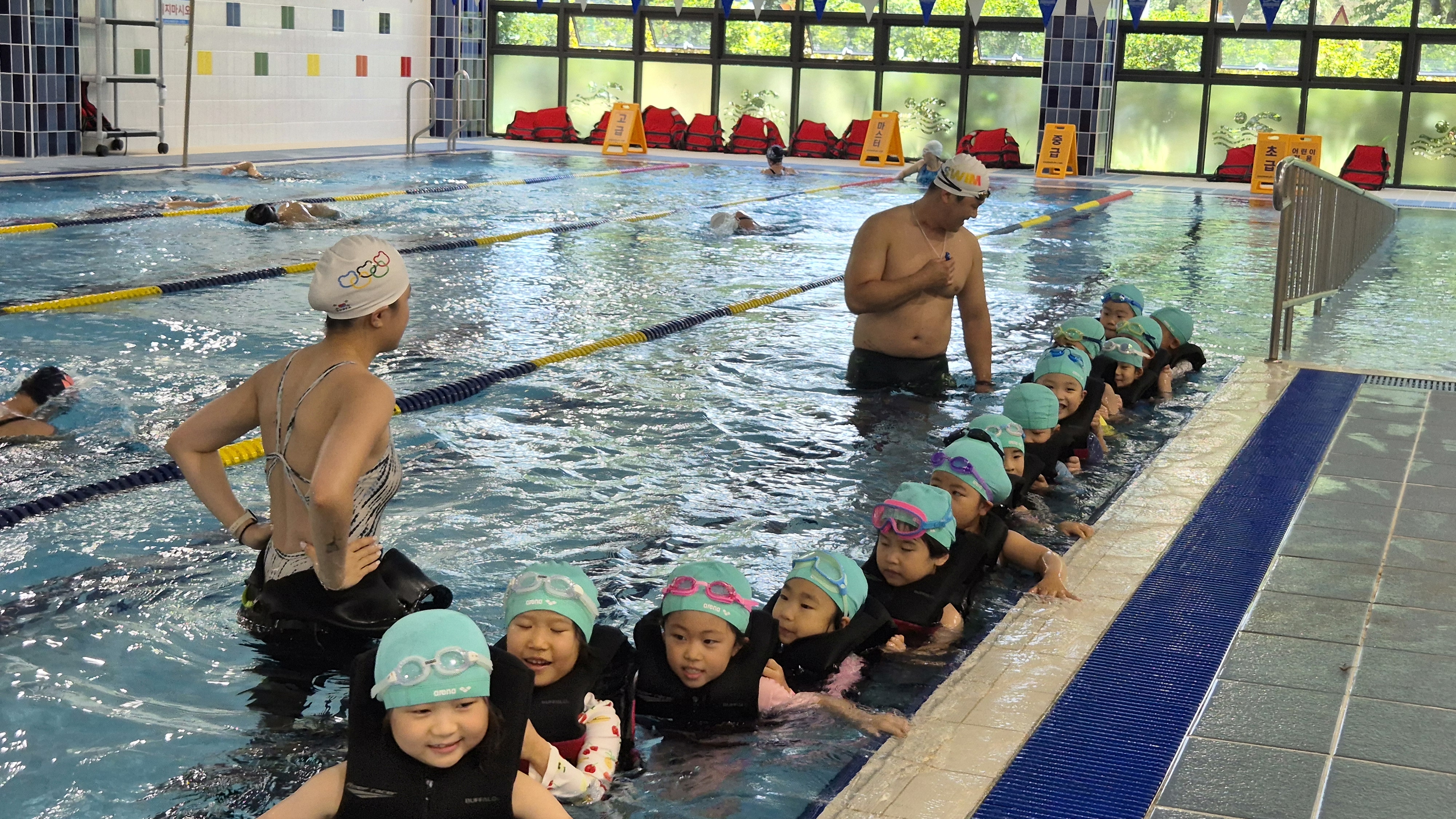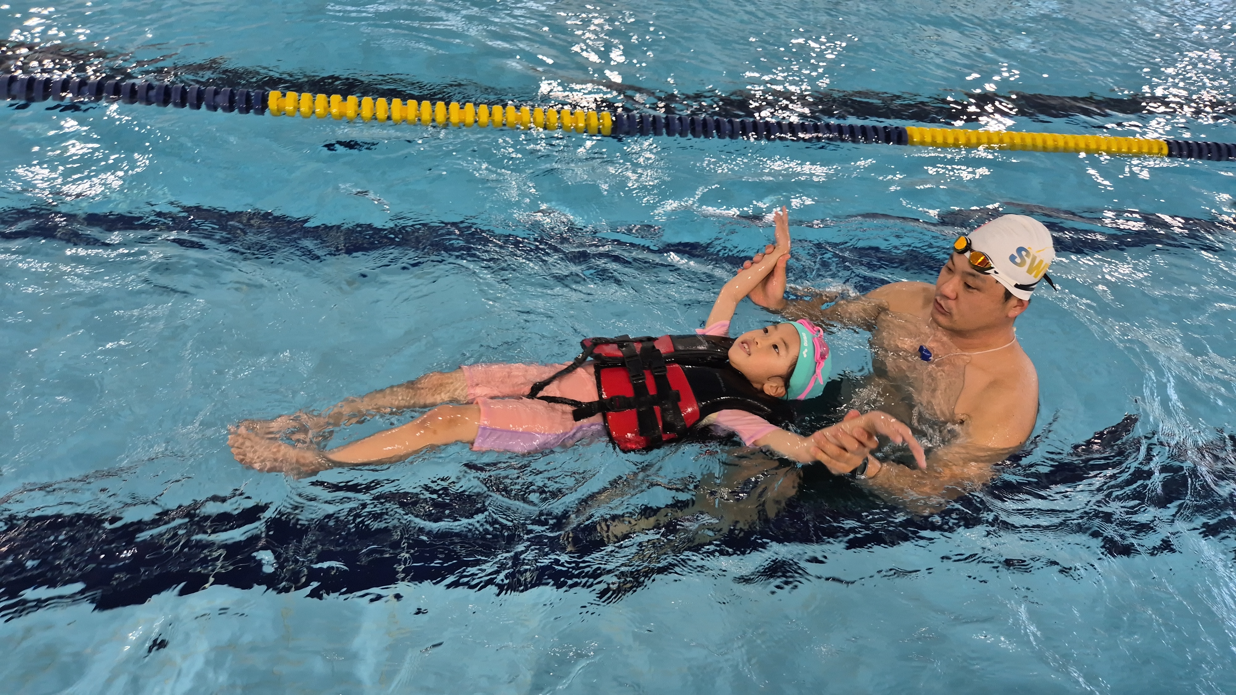 ▷ 안전조끼입고 배형 수영하기