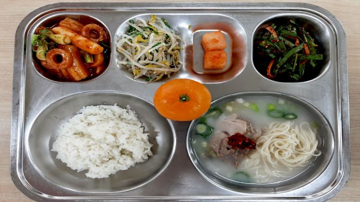 찹쌀밥* 돼지국밥/소면사리* (5.6.9.10)숙주미나리무침* (5.6)자율-부추겉절이 (5.6.13)마라떡볶이* (1.2.5.6.10.12.13.15.16.18)깍두기* (9)귤* 자율-양념장(국밥용) (5.6.9.13)