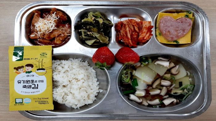 찰현미밥* 표고감자맑은국* (5.6.9)눈꽃치즈닭갈비(데이11 초) (2.5.6.13.15)하트햄계란전 (1.2.5.6.10.15.16)딸기* 유기농김* 배추김치* (9)