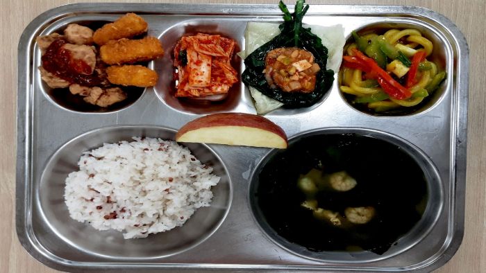 수수밥* 해물미역국* (5.6.9.13.18)카레볶음우동* (2.5.6.10.12.13.16.18)가자미순살강정&두부스틱* (1.5.6.12.13)배추김치* (9)사과* 자율-양배추,케일/강된장 (5.6)